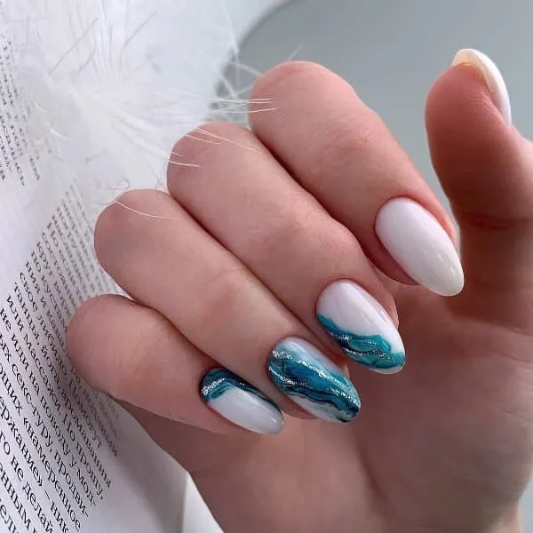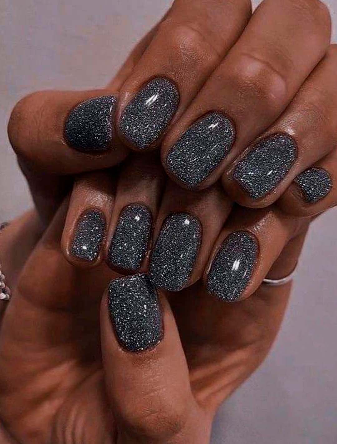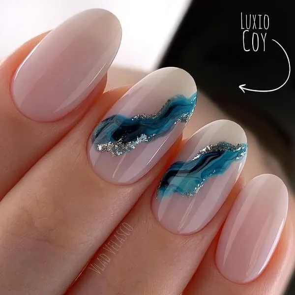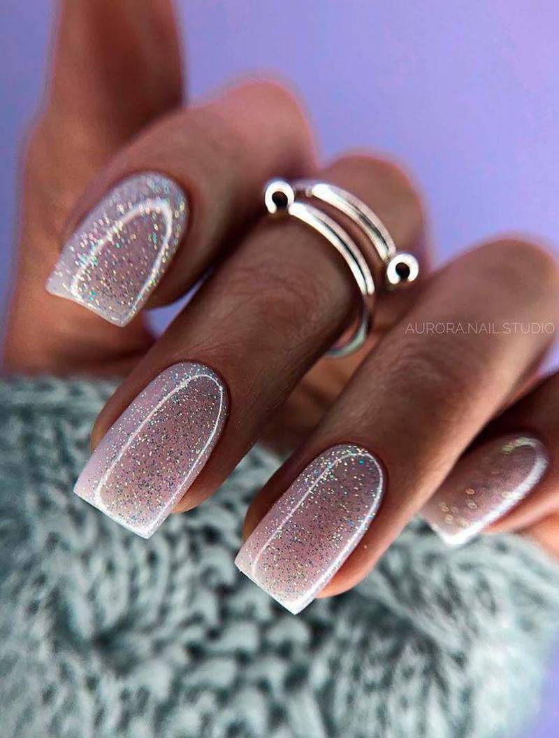 Атмосферный дымчатый маникюр становится еще более элегантным и выразительным, если использовать сверкающие мазки кисти. Например, допустимо добавить дробленые частицы глиттера вдоль направления дымки, чтобы подчеркнуть дизайн. Холодная палитра маникюра сочетается с серебряными украшениями, которые очень популярны зимой