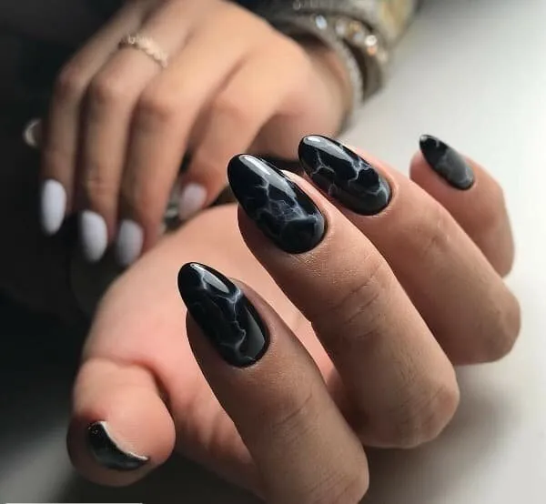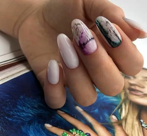 Зимой 2023 года советуем попробовать маникюр «разные руки», который выглядит сдержанно и элегантно. Например, на одной руке целесообразно взять на вооружение дизайн дым, а на остальных выполнить однотонное покрытие.