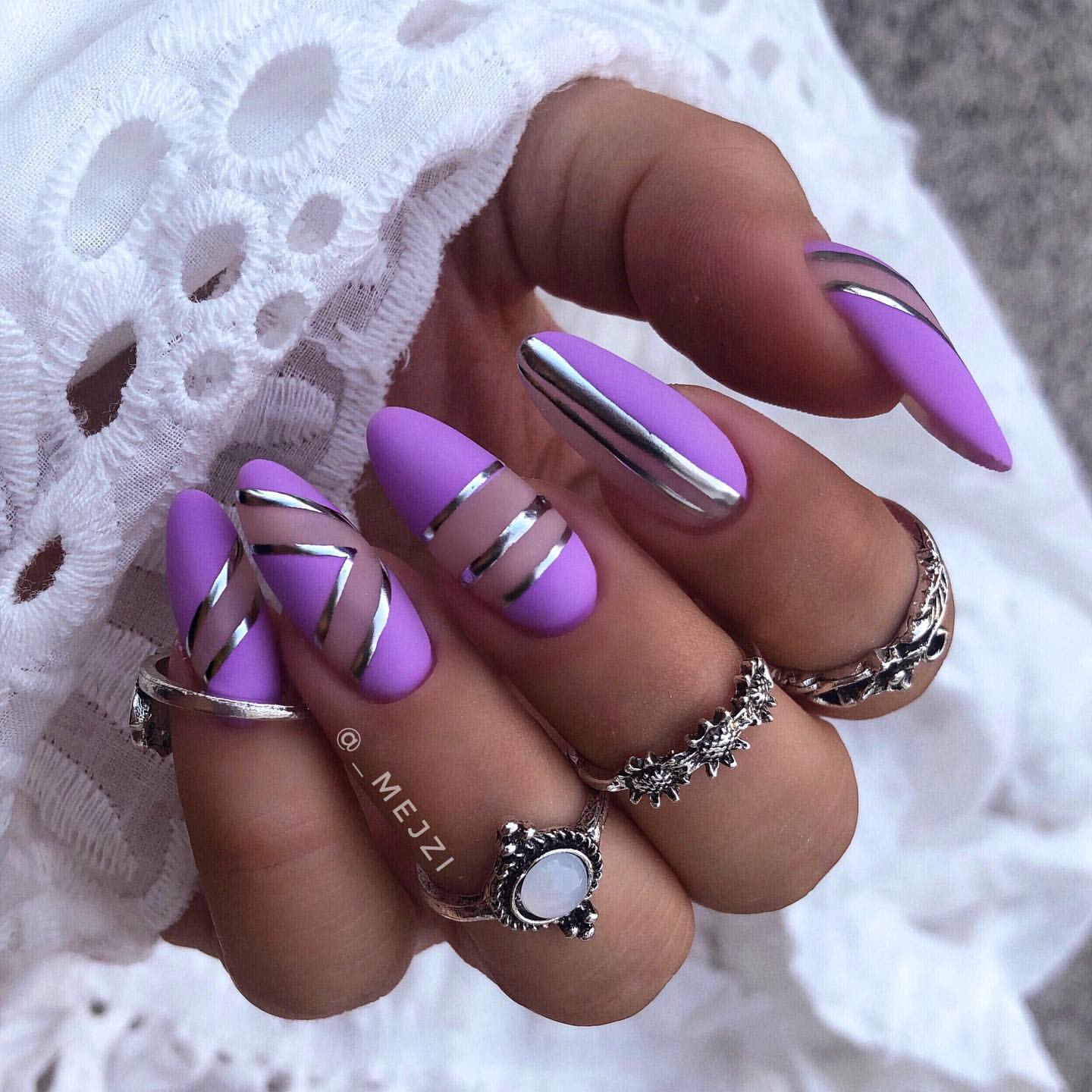 Фольгированные ленты помогут в создании стильного и эффектного геометрического дизайна. Ленты можно найти в любом маникюрном магазине, где представлен материал разной расцветки (серебряная, золотая, радужная) и ширины.