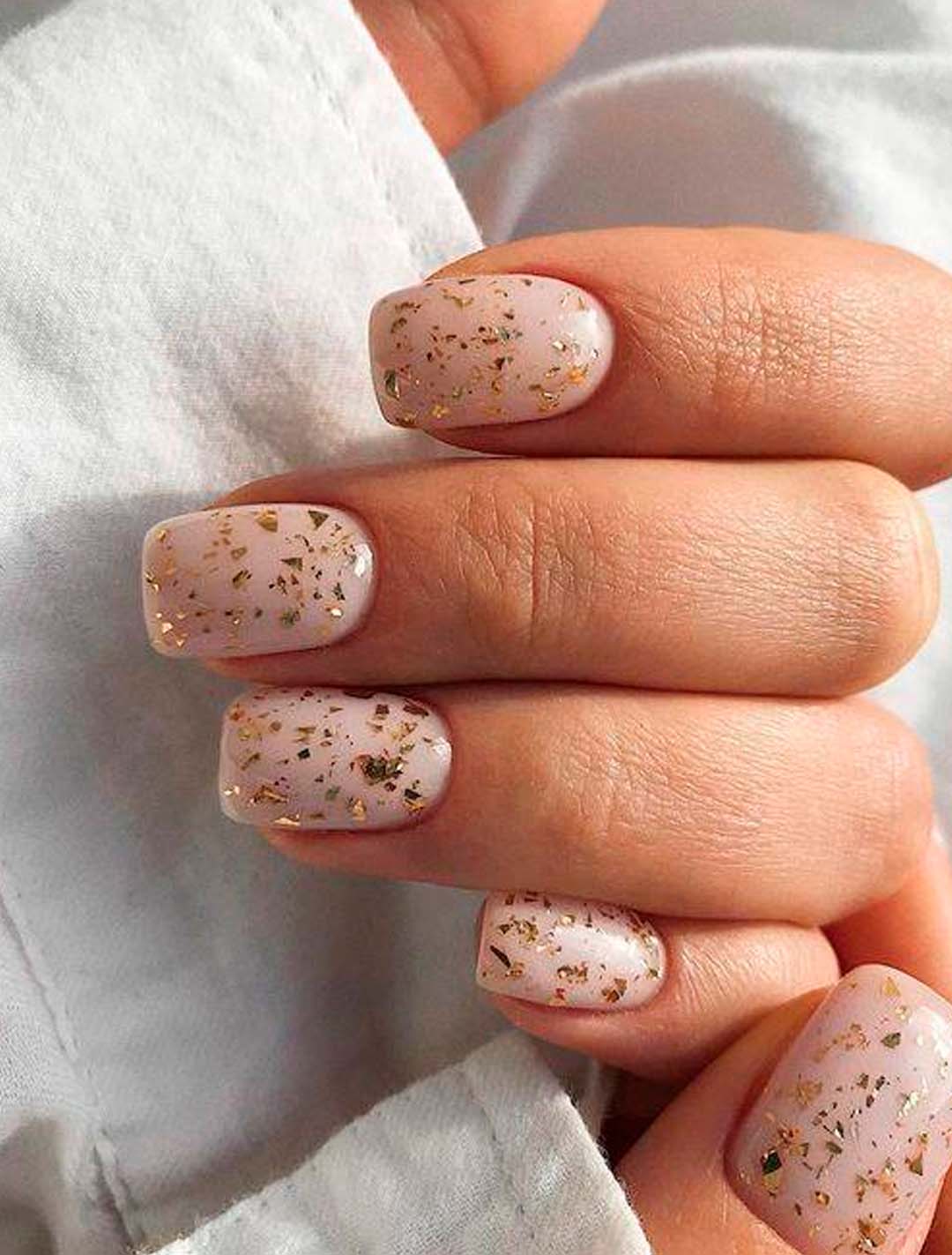 Еще одна идея для современного маникюра с блестками — дополнение в виде отпечатков фольги. Детали украшения можно сочетать с частицами блесток в тон.