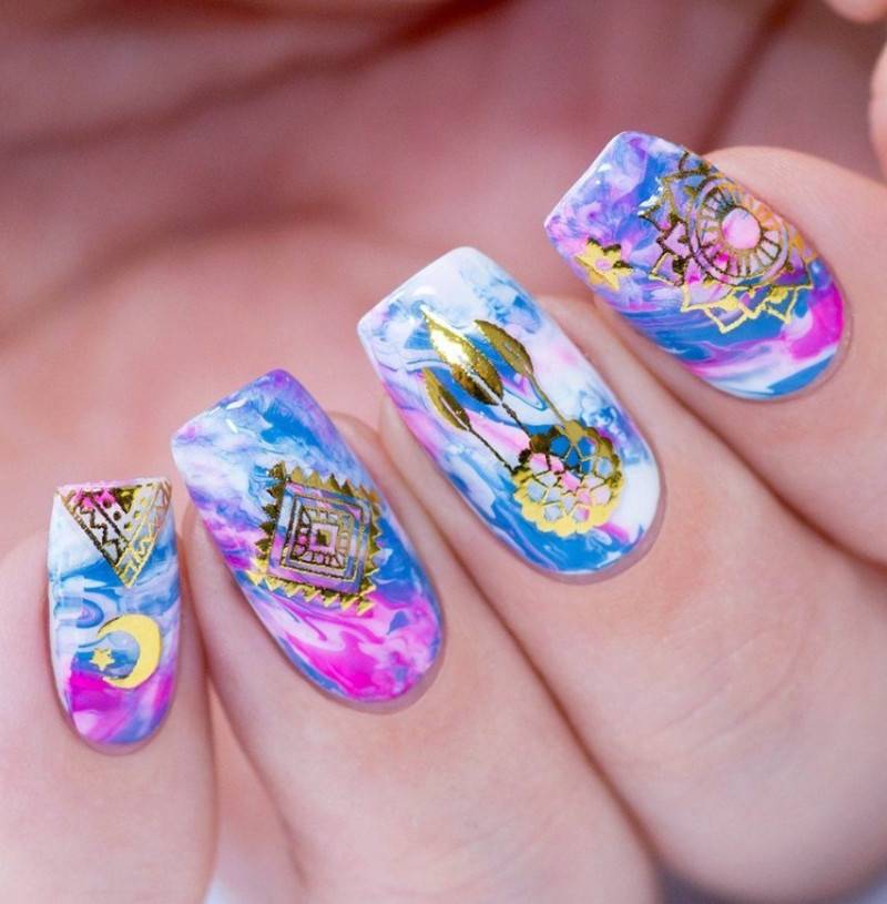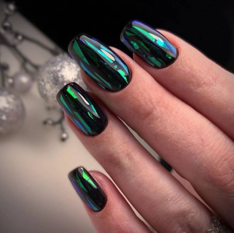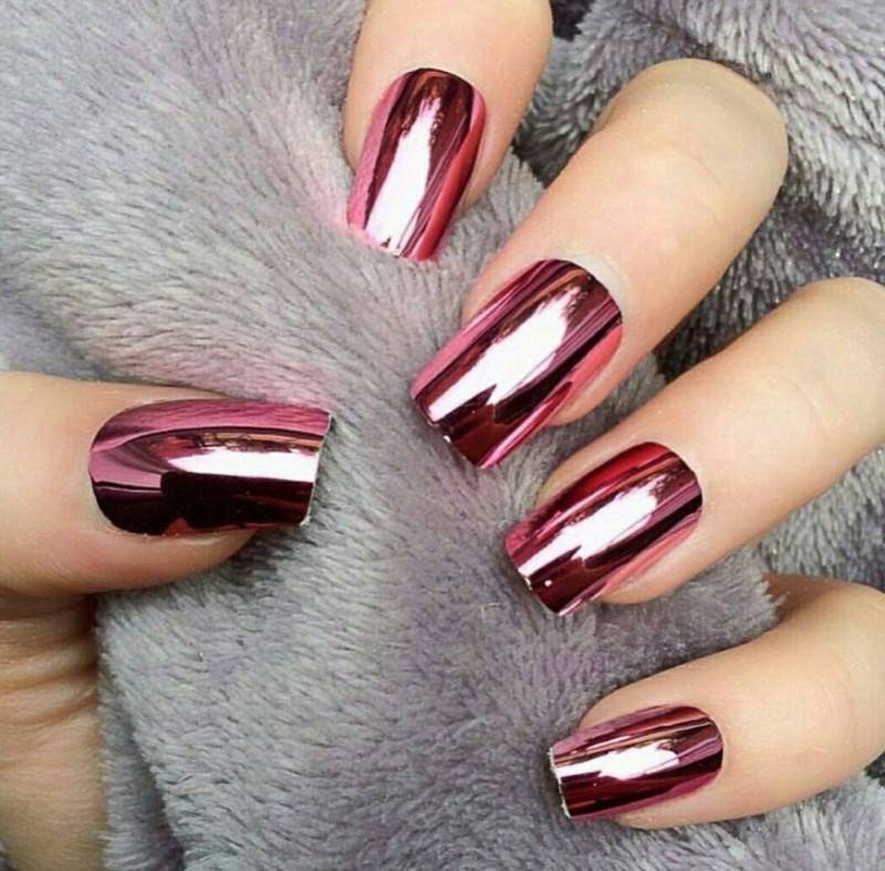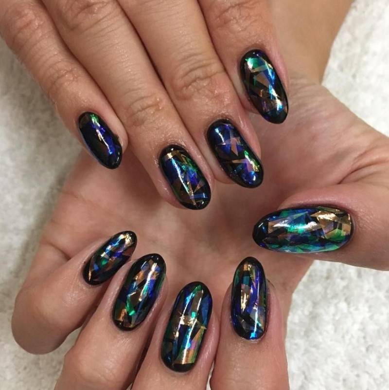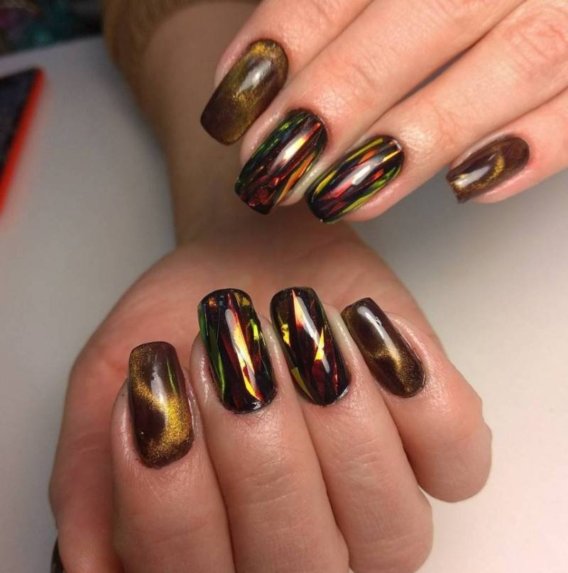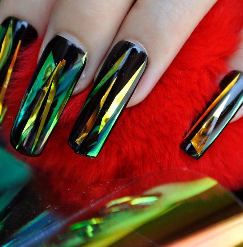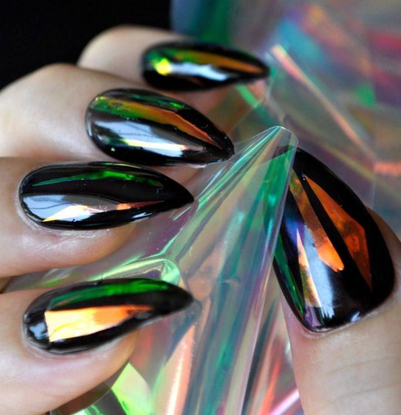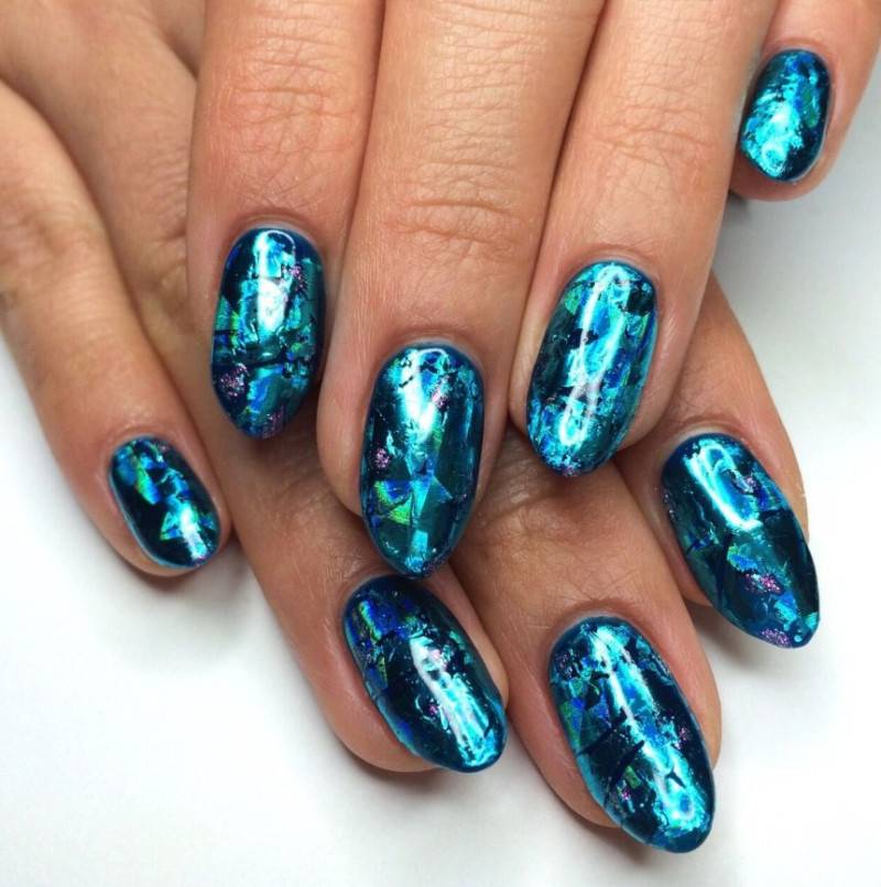 С помощью недорогой фольгированной плёнки можно создавать потрясающий нейл-арт по типу литья или расплавленного металла разных оттенков.
