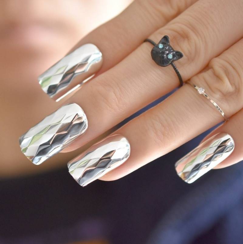 Два ярких оттенка металла можно сочетать в одном нейл-дизайне. Особенно это актуально, если необходим праздничный маникюр