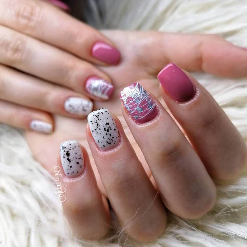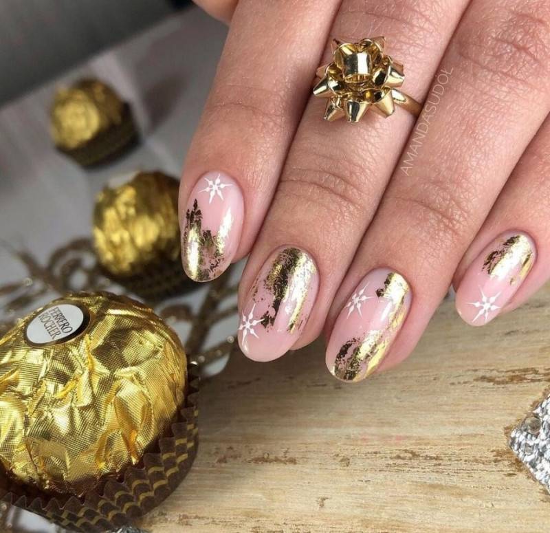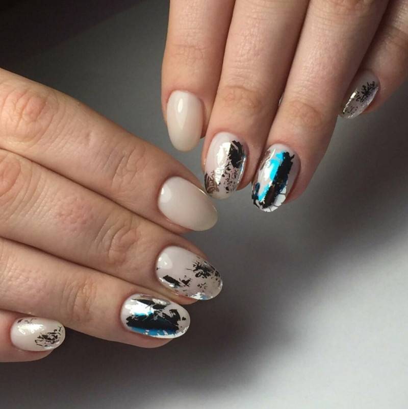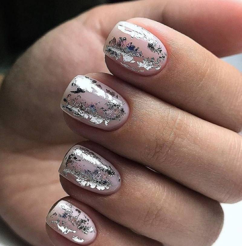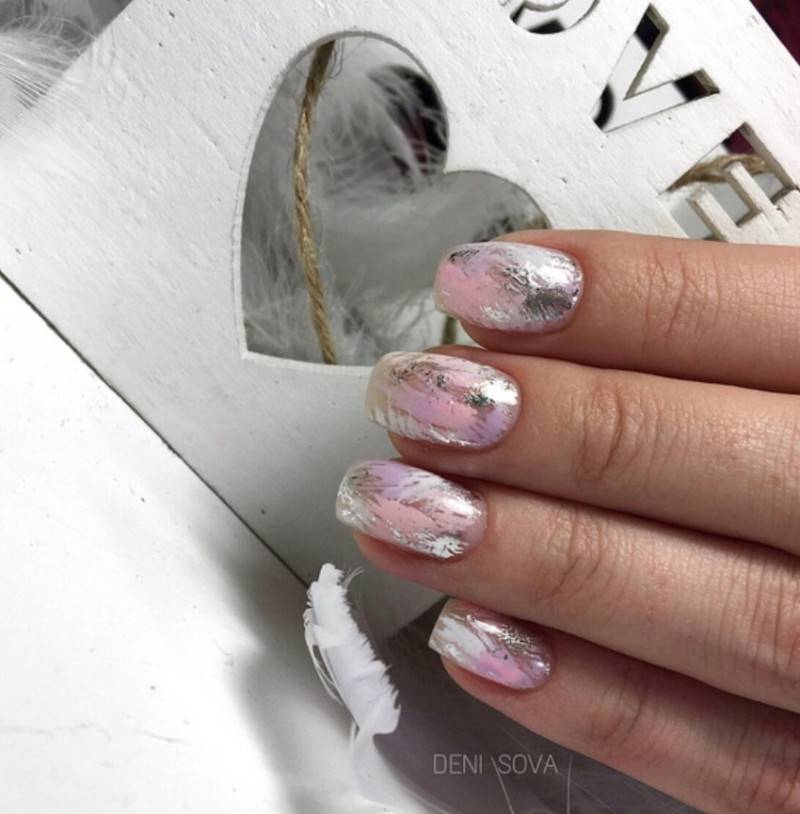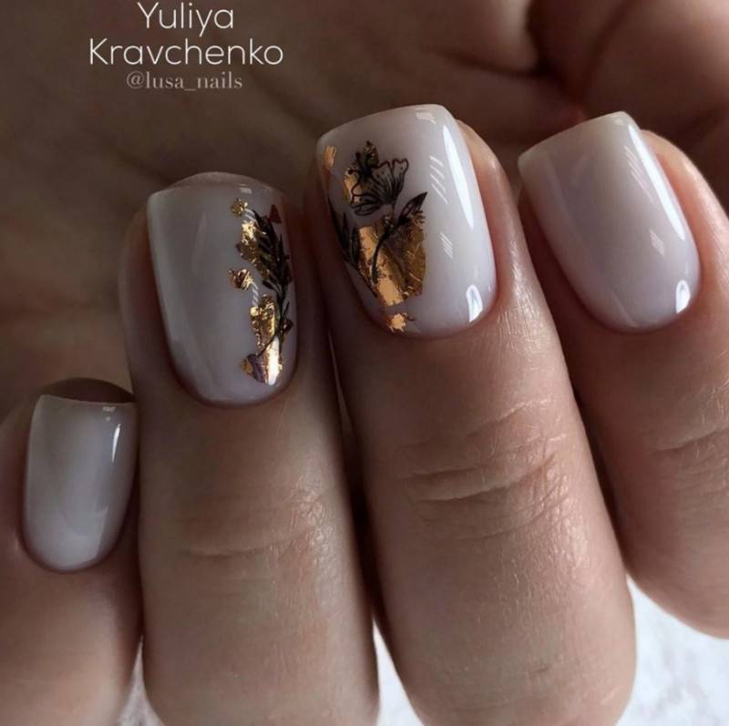 Хотя в этом маникюре присутствуют блестящие элементы в виде фольги, но они приглушены матовым топом. В качестве основы идеальный молочный гель-лак.
