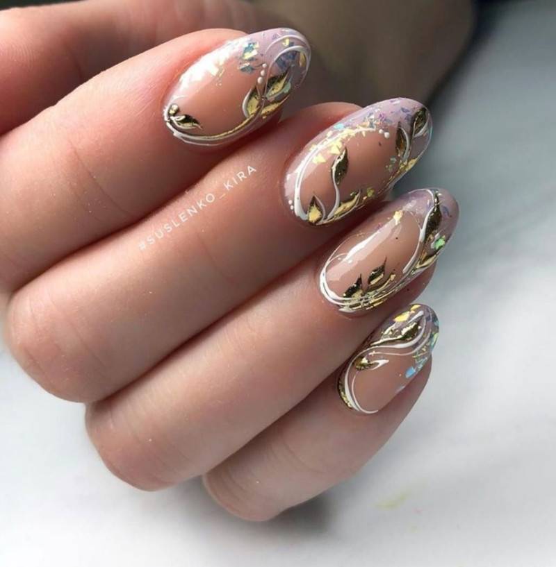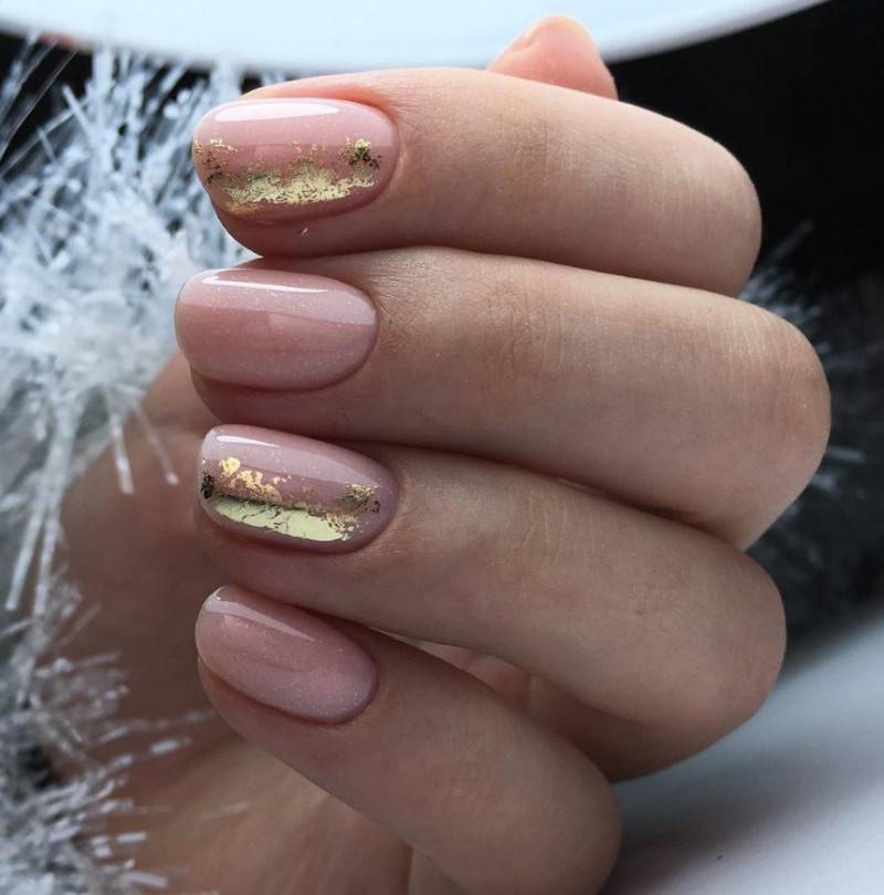 Золотой необязательно используется как дополнение к контрастным ярким цветам. Сделать маникюр более заметным и изысканным, но сдержанным, можно, если сочетать золото с бежевым или нежными нюдовыми тонами лака. Здесь для дизайна подойдет любая техника маникюра.