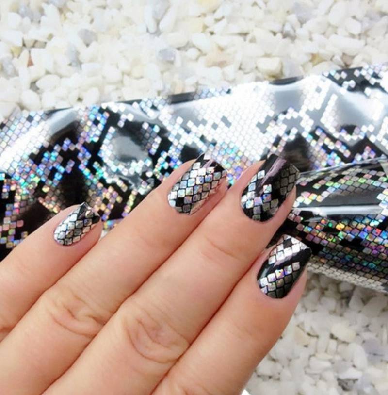 Фольга для декора ногтей бывает разных цветов, поэтому спектр ее применения довольно велик. Ею можно покрывать как полностью ногтевую пластину, так и отдельную ее часть. Из фольги можно вырезать различные фигуры, полоски