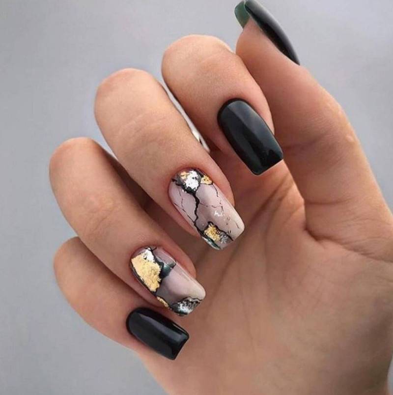 Сочетая рассматриваемый цвет с черным, можно получить поистине шикарный нейл-дизайн. Мрачный черный станет прекрасной базой для любого вида декора. Основу можно взять любую — блестящий глянец, матовое поле или флоковое покрытие.