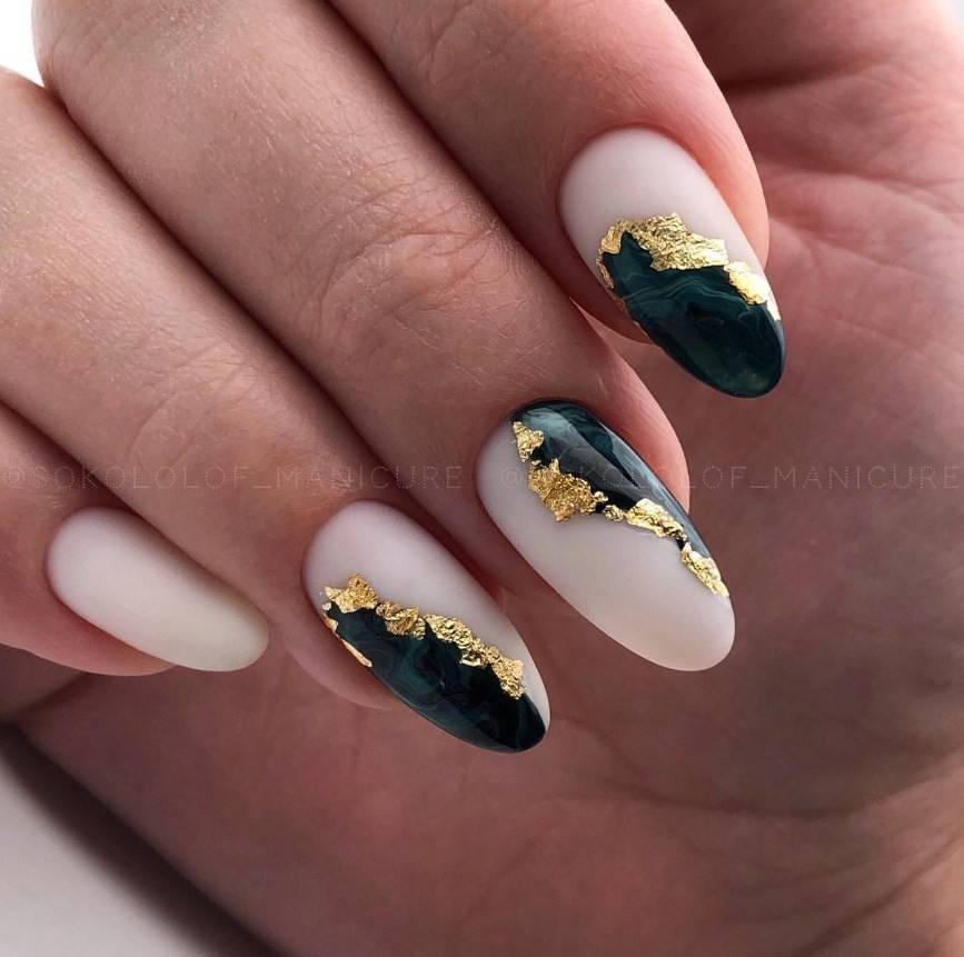 Природные оттенки зелени в комбинации с золотом — один из лучших вариантов нейл-дизайна в сезоне 2021-2022. Яркие цвета радуют глаз и подходят для лета, весны. Зимой с помощью этого тандема можно воплотить в жизнь новогодний дизайн ногтей.