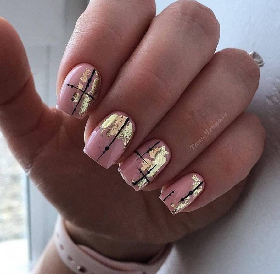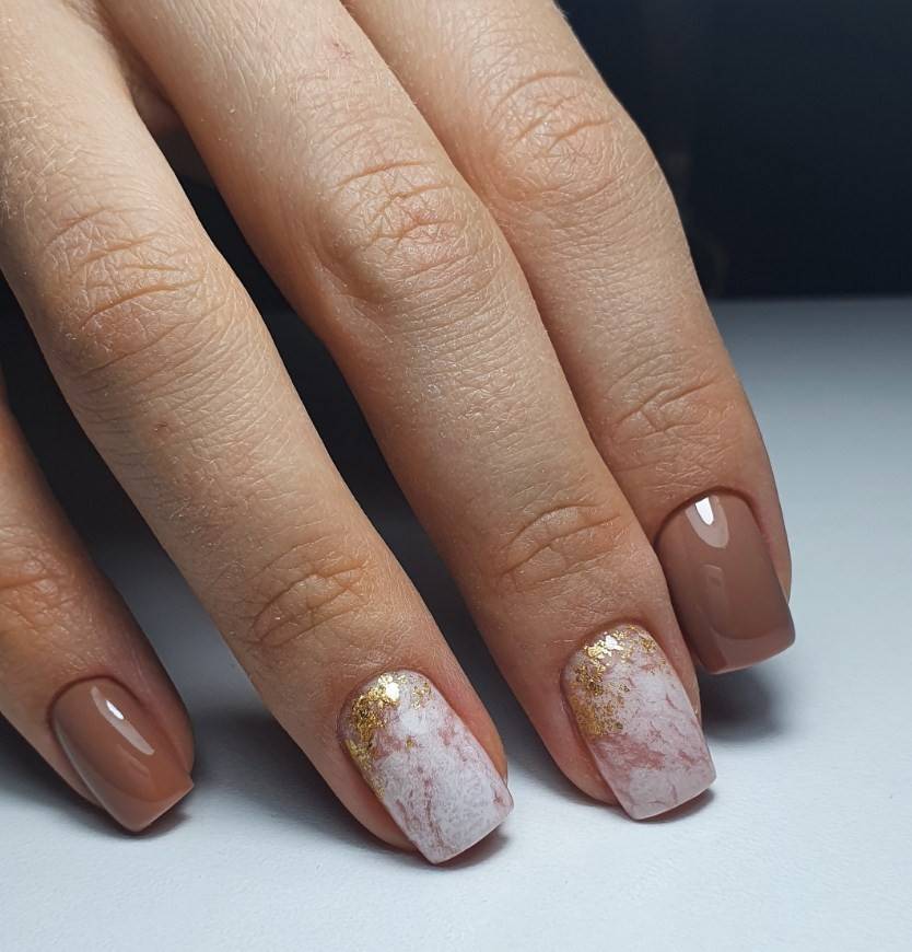 Золотой необязательно используется как дополнение к контрастным ярким цветам. Сделать маникюр более заметным и изысканным, но сдержанным, можно, если сочетать золото с бежевым или нежными нюдовыми тонами лака. Здесь для дизайна подойдет любая техника маникюра.