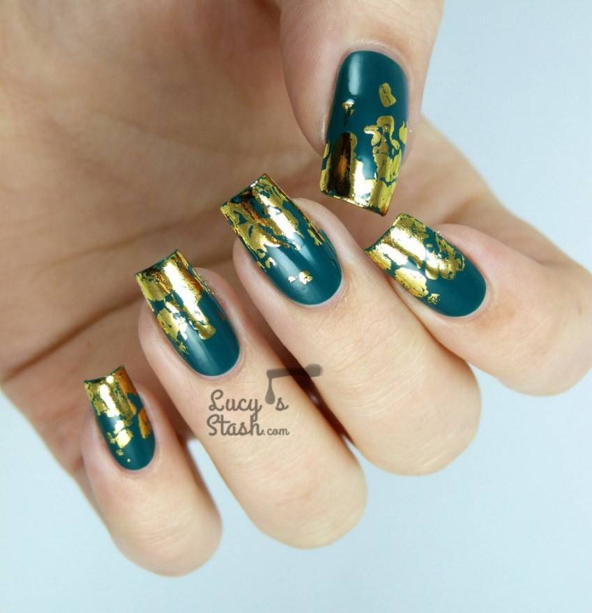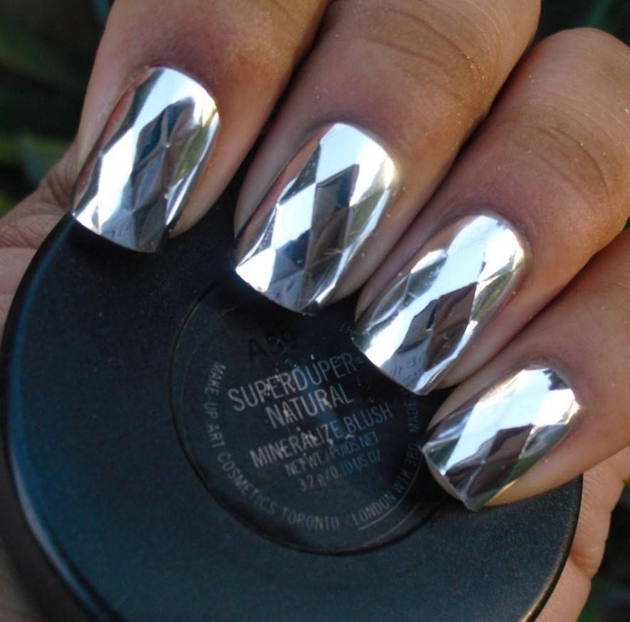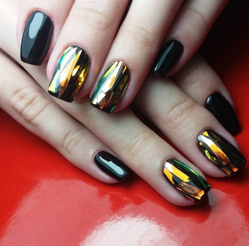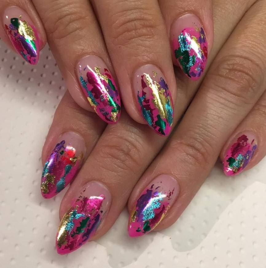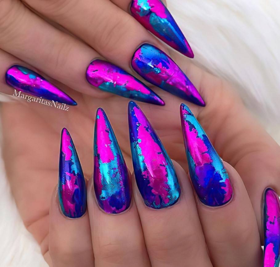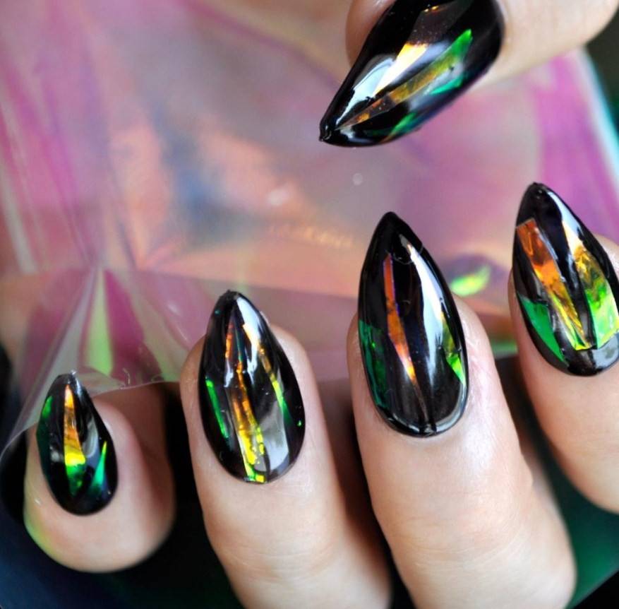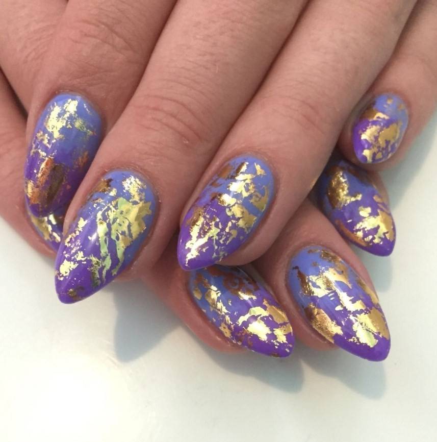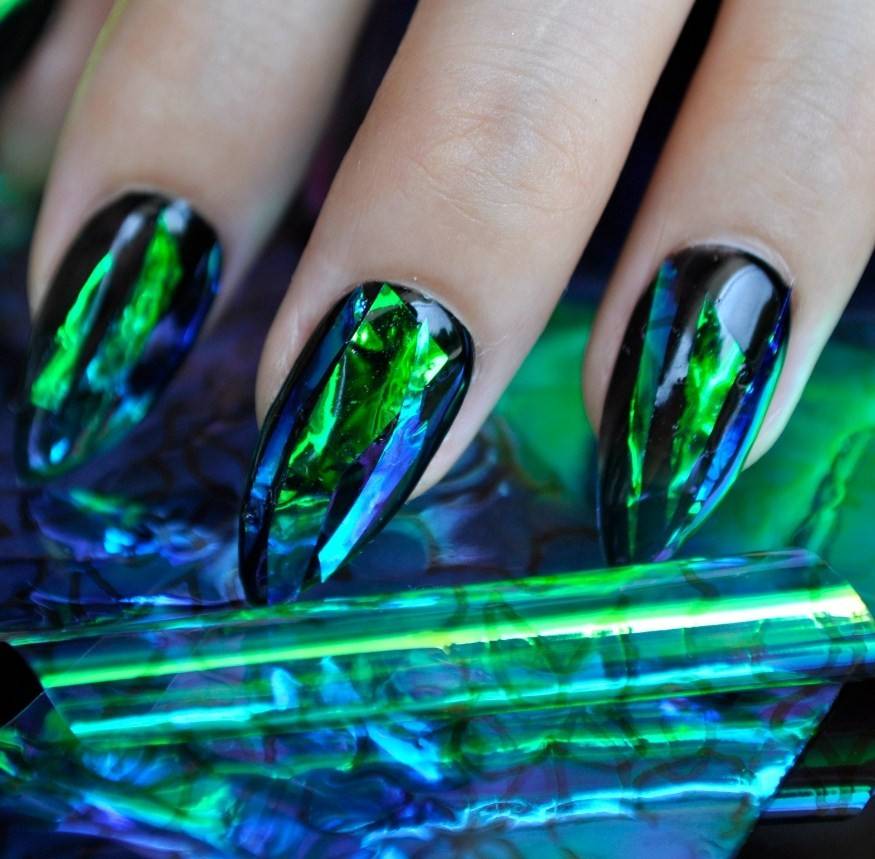 С помощью недорогой фольгированной плёнки можно создавать потрясающий нейл-арт по типу литья или расплавленного металла разных оттенков.