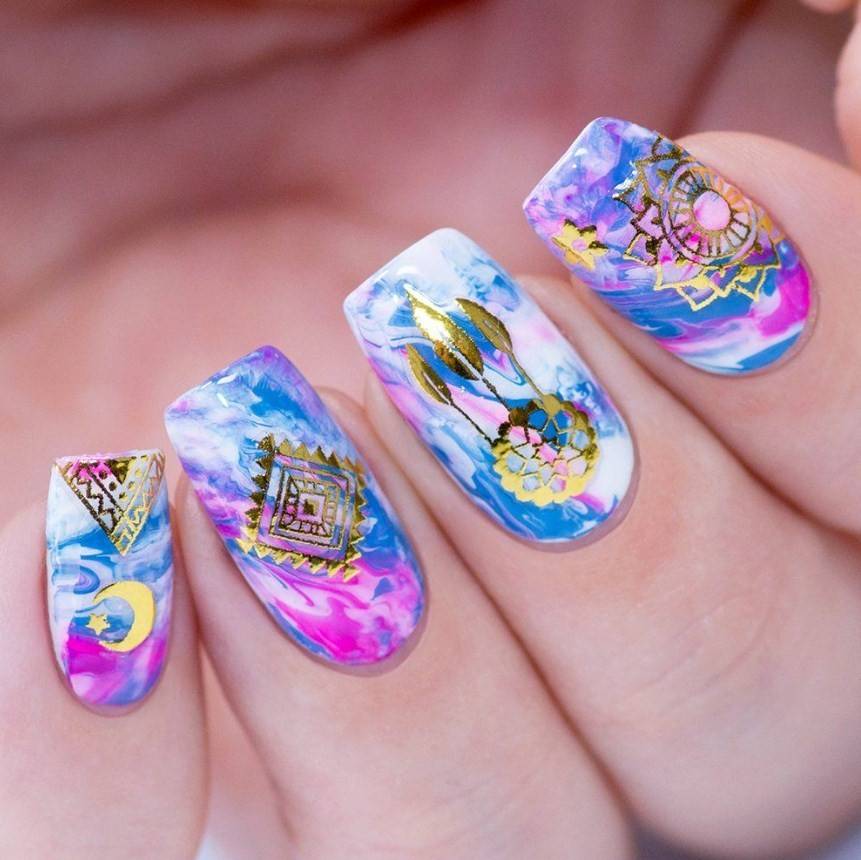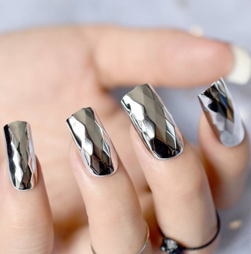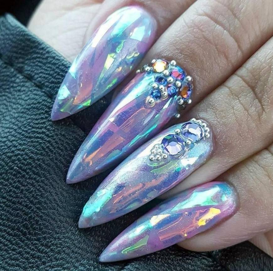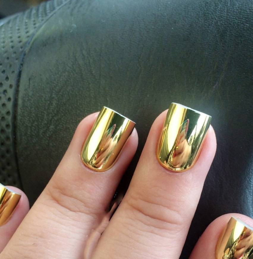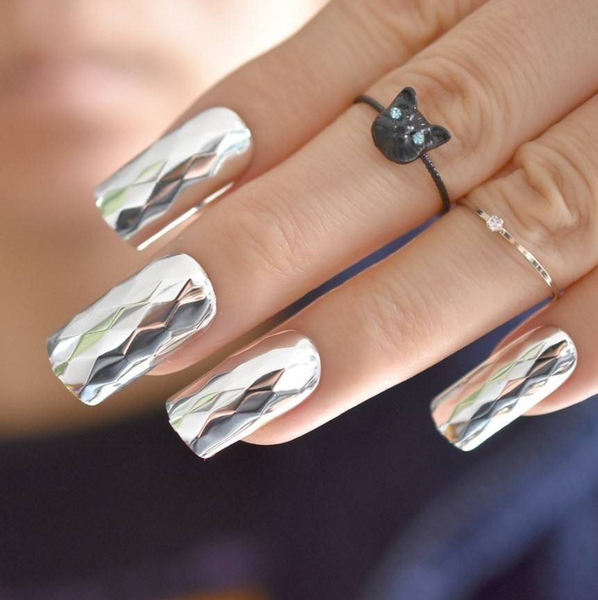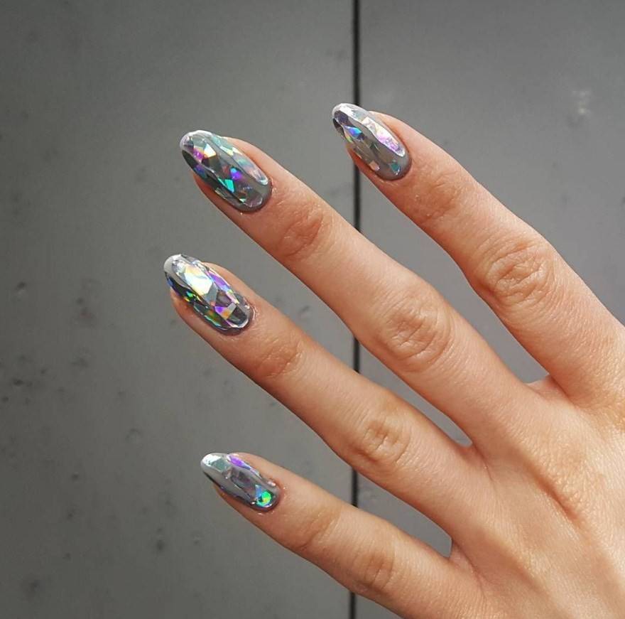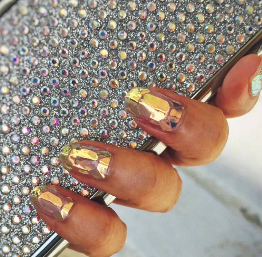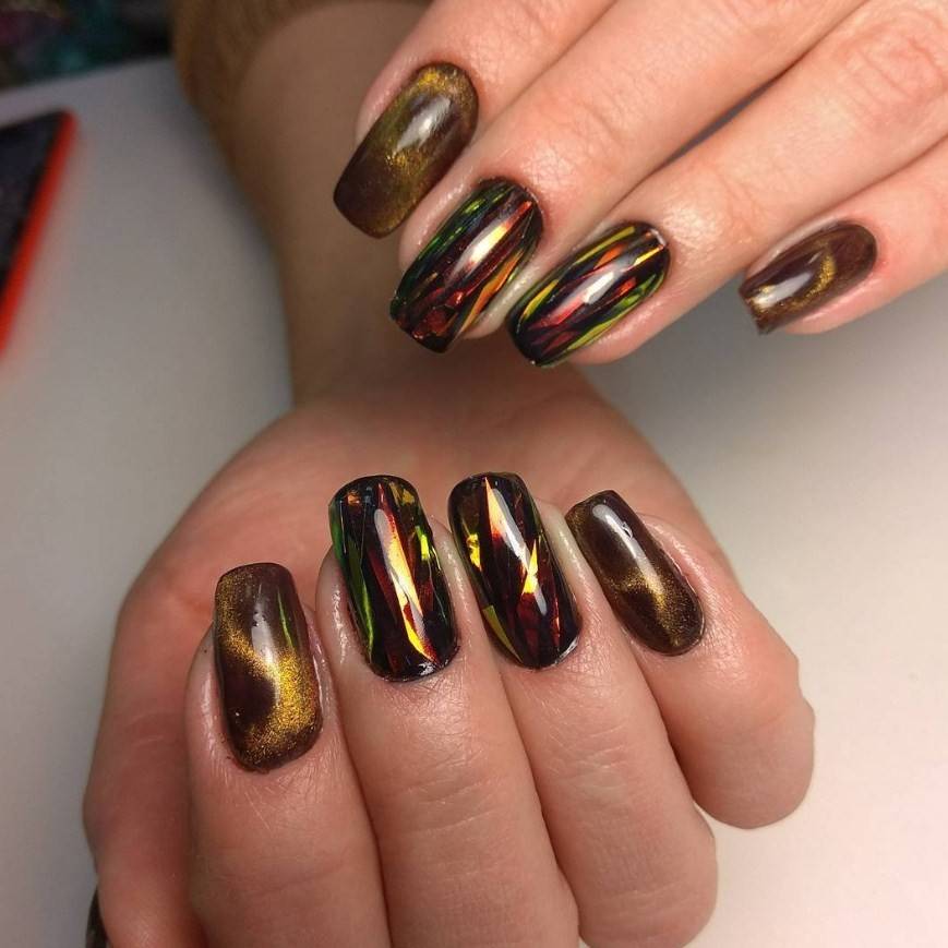 С помощью недорогой фольгированной плёнки можно создавать потрясающий нейл-арт по типу литья или расплавленного металла разных оттенков.