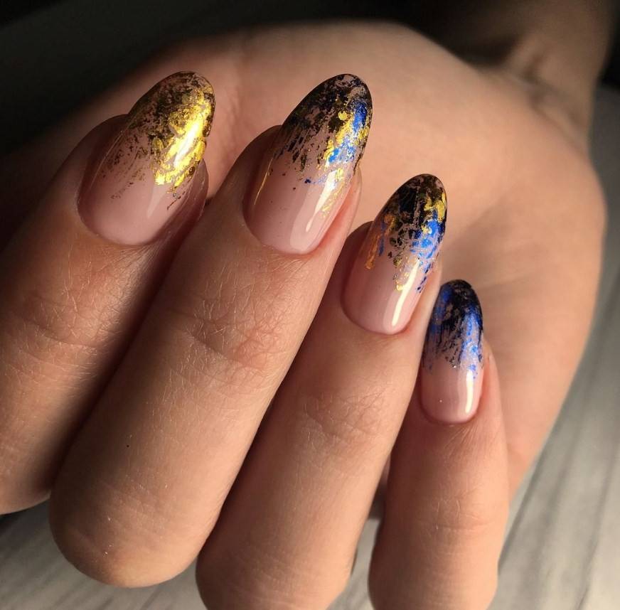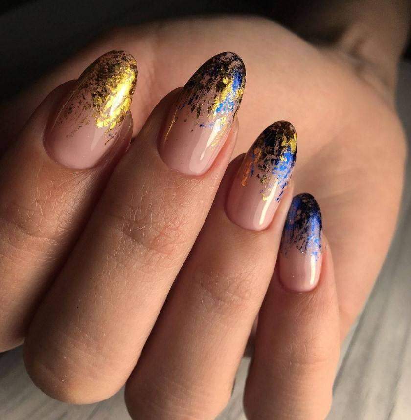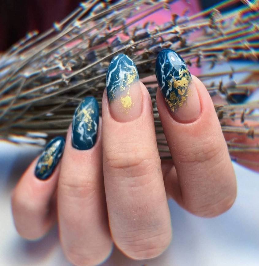 Сочетание глубокого синего и золотого — королевский дизайн. Выбирайте темные оттенки синевы и ваш маникюр обязательно притянет все взгляды. Покрытие может быть любым — матовое или глянцевое.