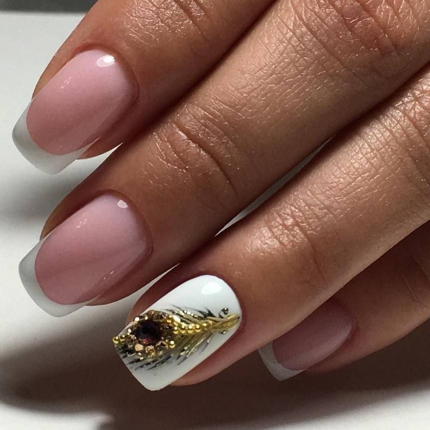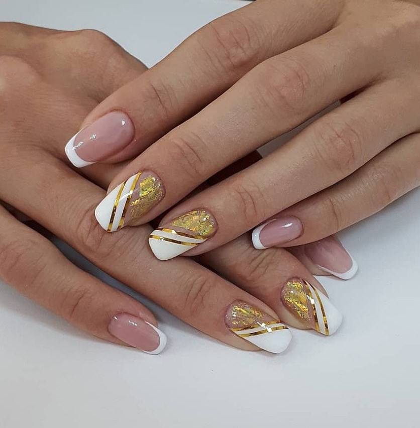 Сочетание белого и золотого — это тандем чистоты и изысканности. Как правило, в дизайне используют белую базу, а декор выполняют золотом. Оптимальный вариант маникюра — золотистый френч или лунный.