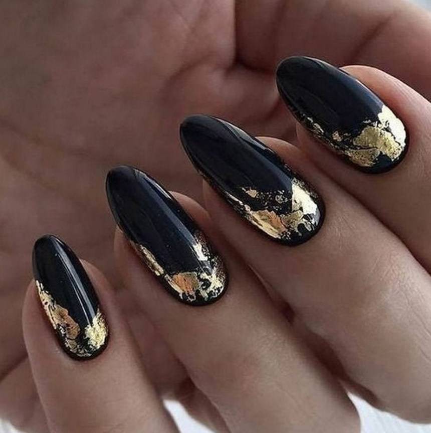 Сочетая рассматриваемый цвет с черным, можно получить поистине шикарный нейл-дизайн. Мрачный черный станет прекрасной базой для любого вида декора. Основу можно взять любую — блестящий глянец, матовое поле или флоковое покрытие.
