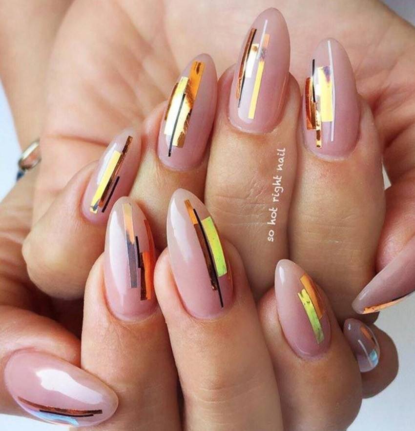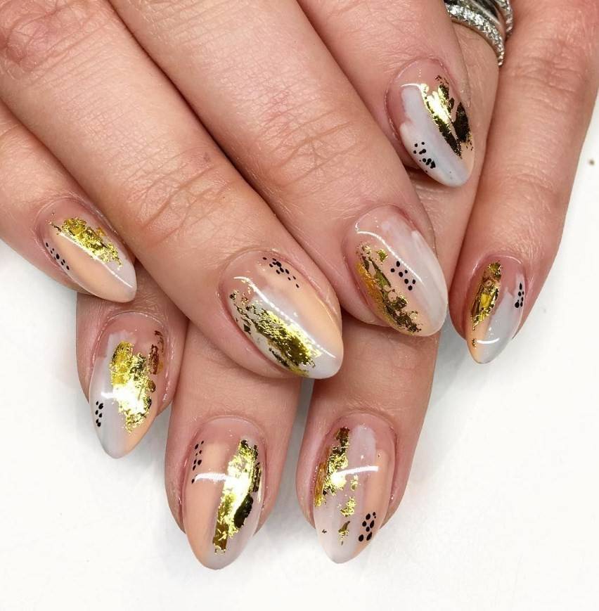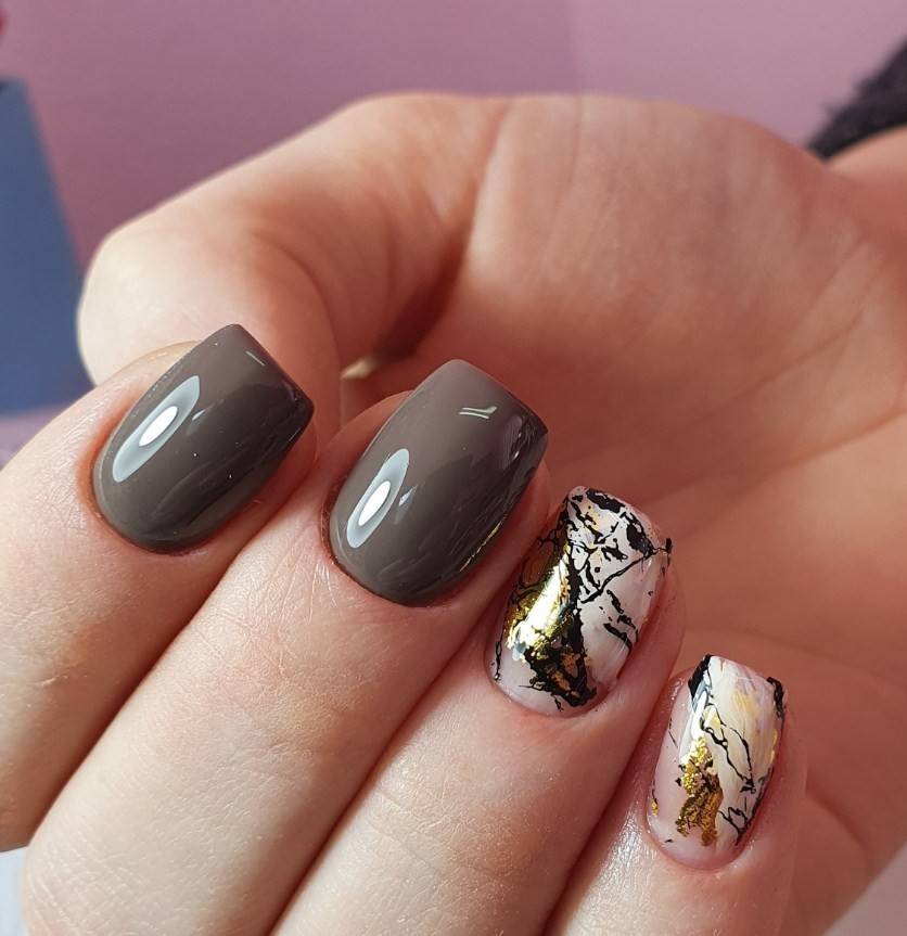 Хотя в этом маникюре присутствуют блестящие элементы в виде фольги, но они приглушены матовым топом. В качестве основы идеальный молочный гель-лак.