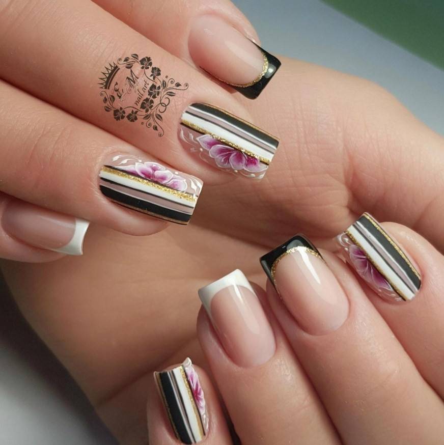 Дизайн выглядит лаконично и изящно. С готовыми полосками можно сделать нейл-арт с узорами, геометрическими фигурами. Техника создания проста:
