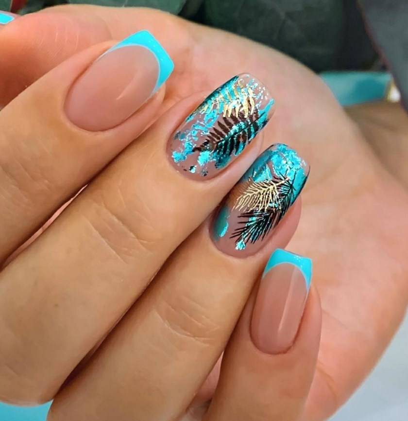 Если поспешить и наклеить ее неправильно, придется переделывать, а чем больше вы снимаете и обратно прикрепляете полоску, тем хуже она впоследствии держится. В случае ошибок при отрезании лента может остаться длинной или быть короче необходимого размера, что также недопустимо. Только аккуратные синие ногти с золотом будут выглядеть безупречно. Останется только нанести слой закрепителя, и можно заканчивать маникюр.