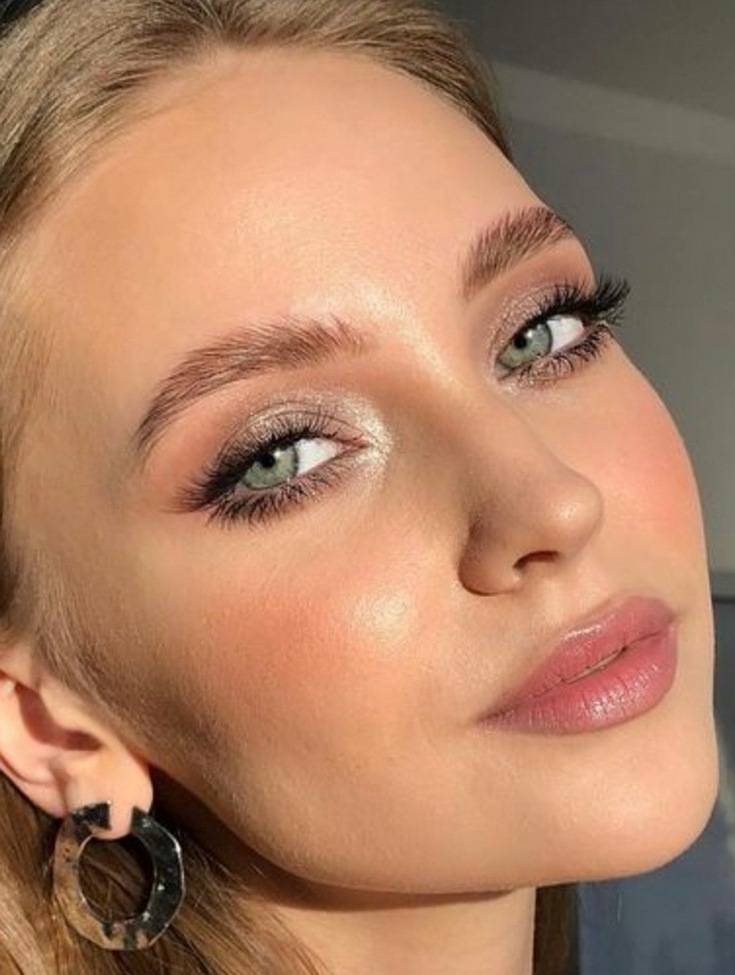 Можно воспользоваться полупрозрачными серебристыми или нюдовыми тенями с мелкими блестящими частичками и нанести их на верхнее веко. После этого и верхние, и нижние реснички следует накрасить черной тушью в несколько слоев. Дополнительный объем и длина идеально впишутся в подобный милый мейк. Кожа лица будет выглядеть более эффектно и ухоженно, если дополнить ее подходящим тональным кремом, легкими румянами.