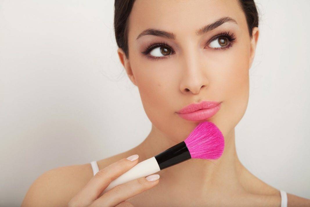 - Нанести румяна. Цвет неяркий, приближенный к оттенку кожи. Средство с розовым пигментом подходит для светлой кожи, с оранжевым – для более смуглой. Румяна выбирают рассыпчатые или сухие прессованные. Наносить кисточкой с широким веером на яблочки щек в направлении к мочке уха;