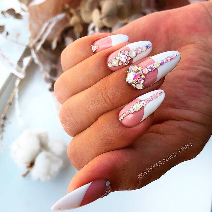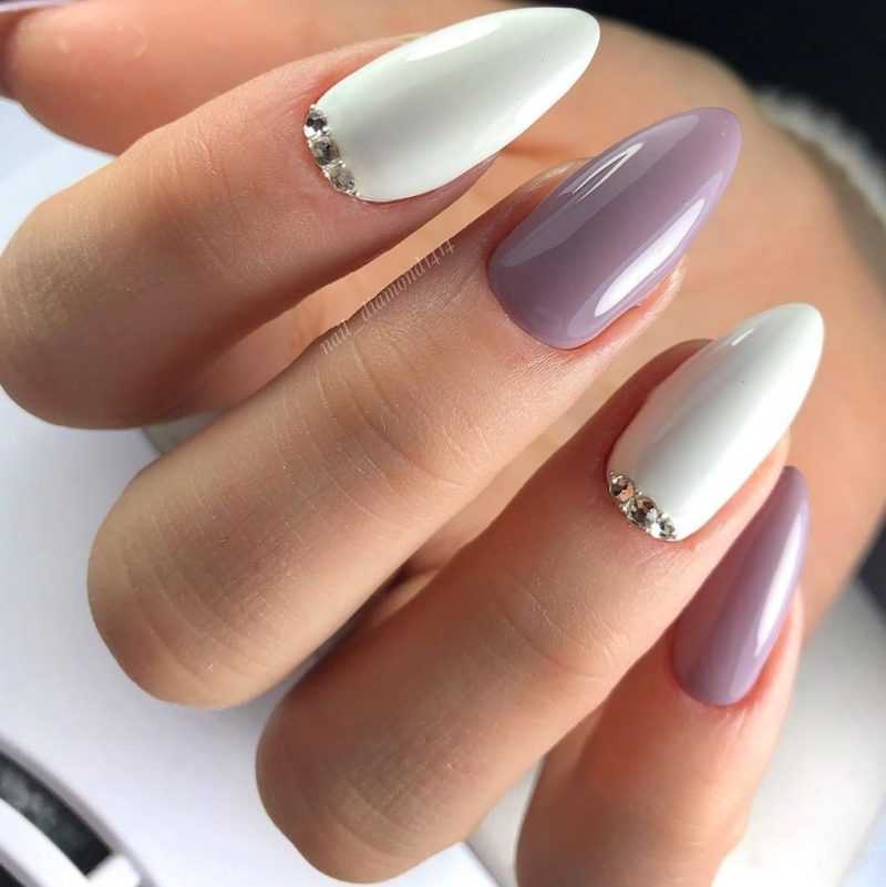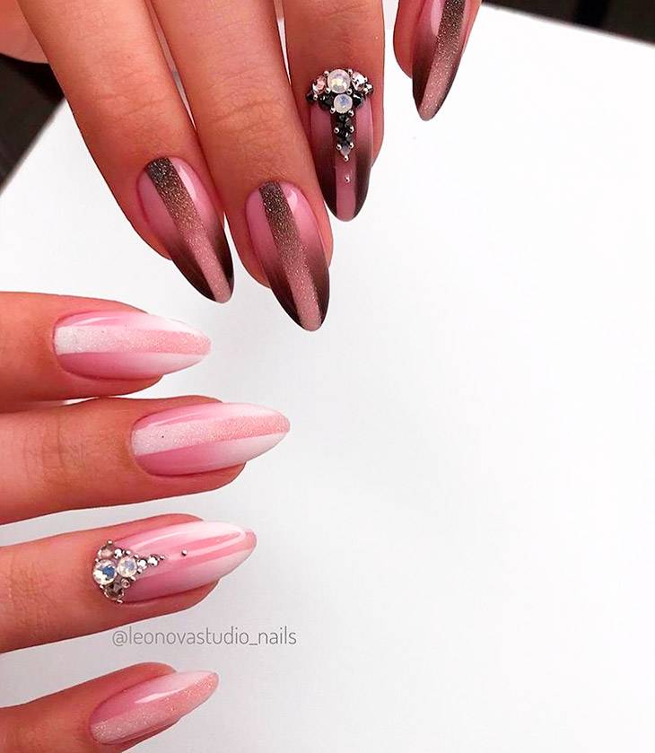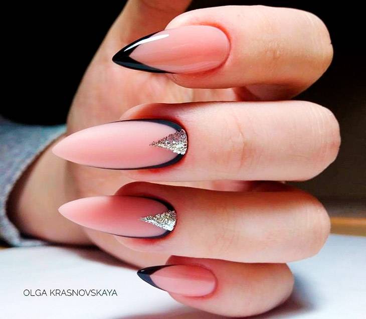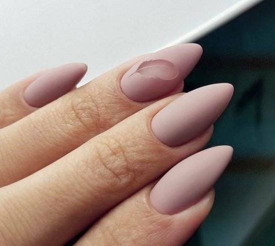 Прекрасный вариант для заостренных ногтей нежные нюдовые цвета. Если хочется более праздничный лук, то смело добавляйте блестки, строгую геометрию. Нежности придадут: розовый, лавандовый, молочные цвета. Незаменим в этом плане и всеми любимый французский маникюр.