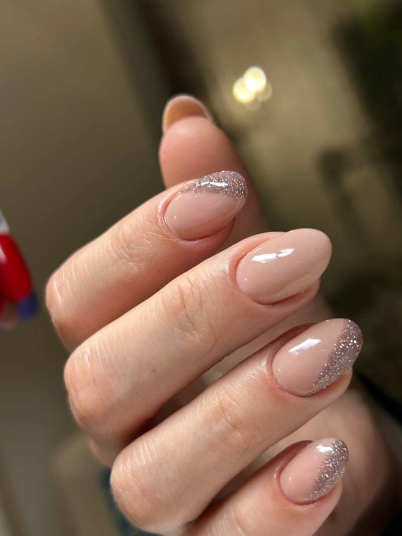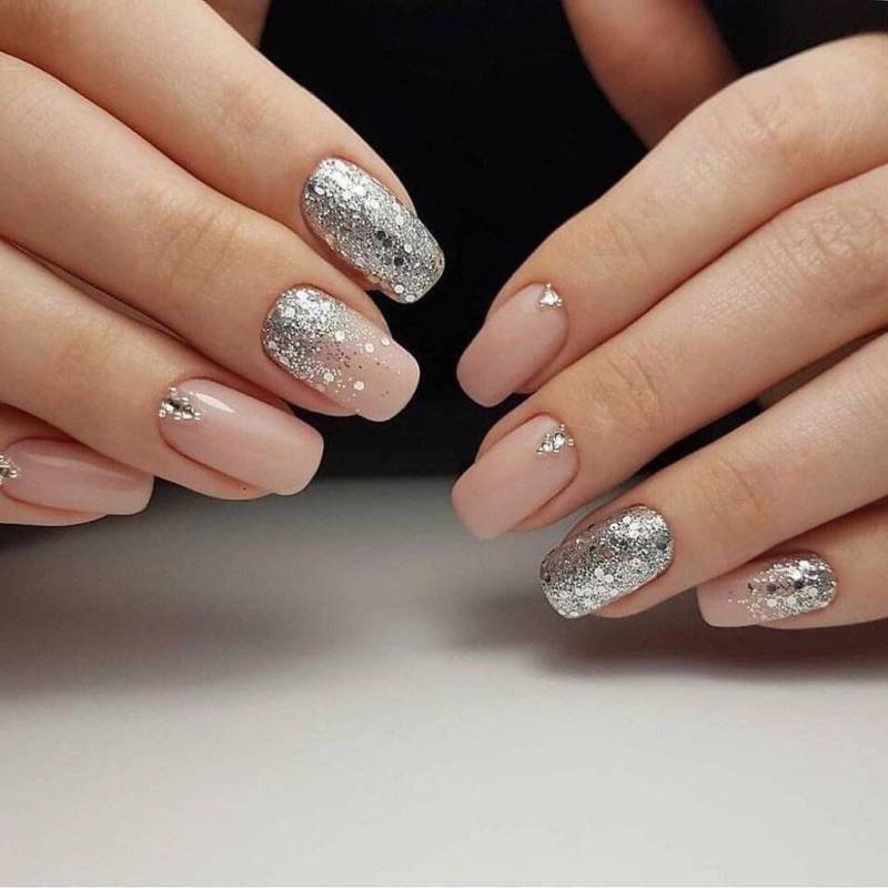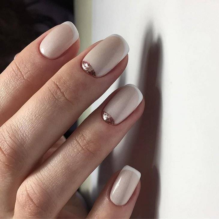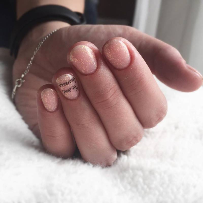 Такой вид декора, как блёстки просто идеально подходит для украшения коротких ногтей, поскольку блестящие частицы имеют разный размер, цвет и форму, а также лишены объёма, что позволит избежать в процессе оформления визуального утяжеления ногтевых пластин в целом. Нежный маникюр с блёстками, который стал одним из трендовых, представляет собой лаконичные идеи оформления в светлых тонах с минимальным количеством сверкающих деталей. Иными словами, блёстки приемлемо использовать для дополнения рисунка либо особенностей выбранной техники, например, прорисовки линии улыбки френча при помощи глиттера либо шиммера.