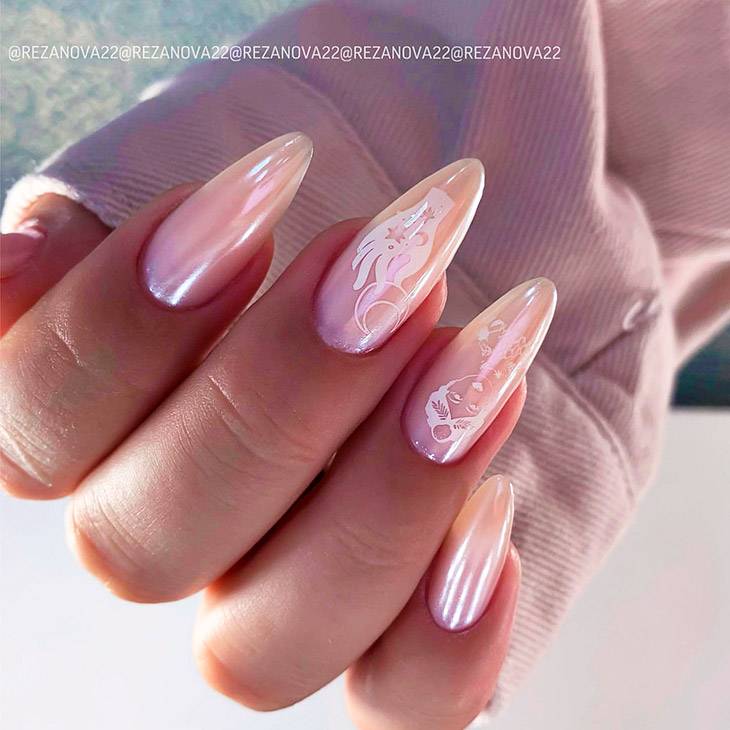 Миндалевидная форма прекрасная основа для нежного дизайна ногтей. Миндаль сам по себе придает женственности, а в совокупности с нежными оттенками лук получается еще и аристократичным.