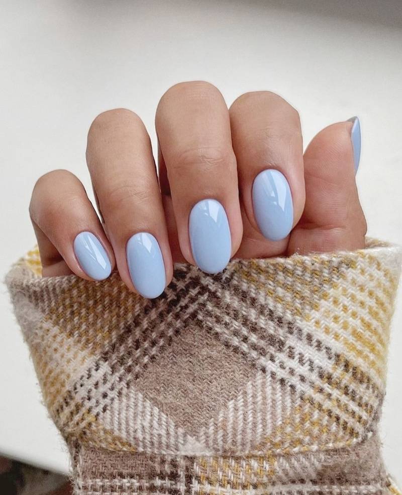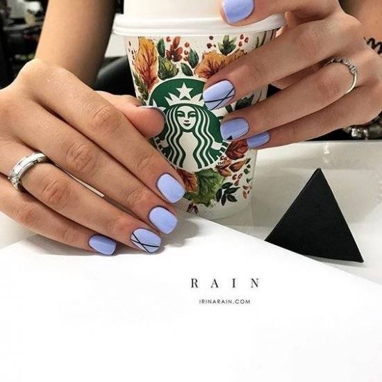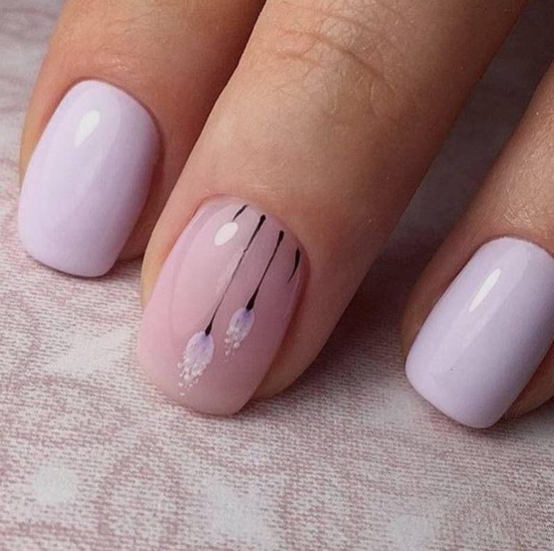 Любительницам коротких ногтей стоит присмотреться к таким цветам как лиловый, лавандовый, небесный и пыльная роза. Небольшая длина — это практично и к тому же стильно, особенно в сочетании с женственными нежными оттенками.