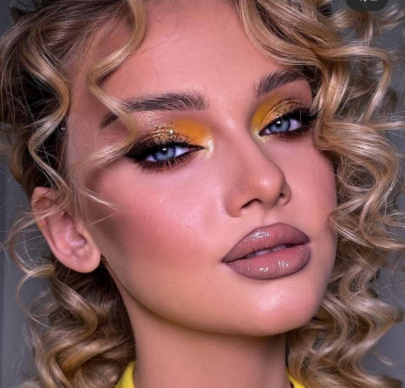 Тени ― жемчужные, песочные, медные, бледно-оранжевые, белые. Лучше использовать сразу два оттенка: умелое их сочетание позволит подчеркнуть необычность и «кукольность» девушки.