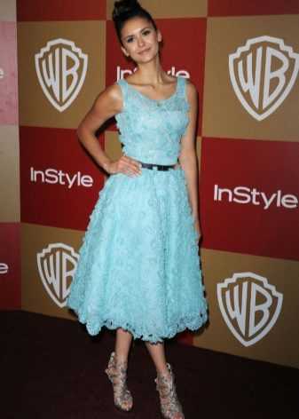 Нежно-голубые и кукольно-пышные наряды – это как раз то, что очень идет стройным жгучим брюнеткам. Нина предпочитает как однотонные варианты, так и модели, украшенные ненавязчивым и стильным принтом.