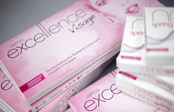 - Excellence. Рассасывающиеся нити, предназначены для маскировки первых признаков старения у женщин после 30 лет. Помимо коррекции овала лица, позволяют избавиться от мимических морщин у глаз и губ, «разгладить» поперечные на лбу и продольные — между бровями. Aptos Excellence Visage отличаются очень стойкой фиксацией, это универсальный вариант для лица. Excellence Beautiful Elegance используются помимо щёк, скул и подбородка для рук и бёдер.