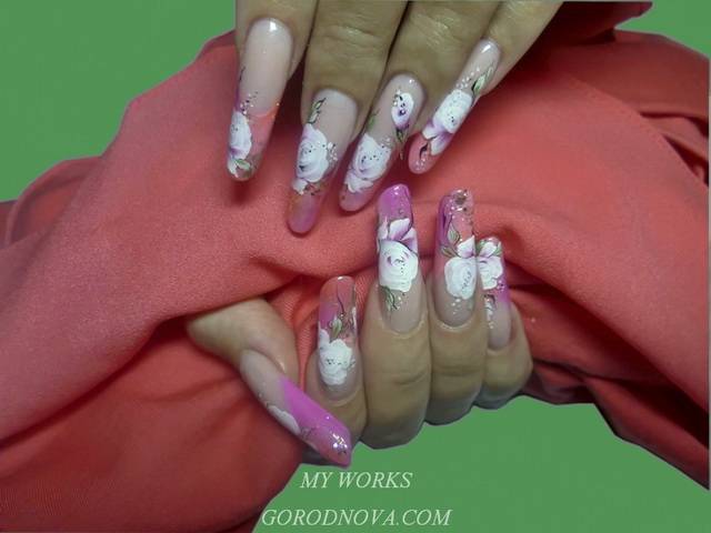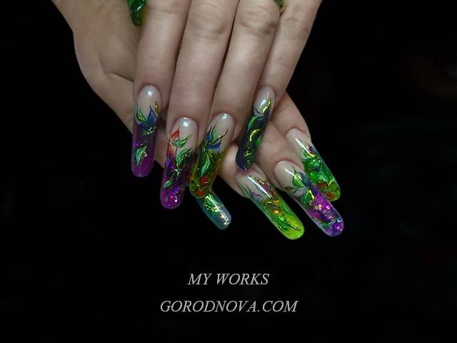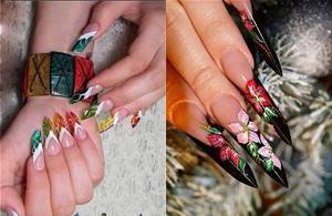 Эйдж с росписью Такая форма хороша сама по себе, без лишних прикрас. Однако столь необычный дизайн, как на фото, придает еще большую оригинальность и яркость маникюру. Роспись обычно наносится уже на полностью смоделированные ногти, перед тем, как закреплять их финишным слоем искусственного материала, будь то гель или акрил.