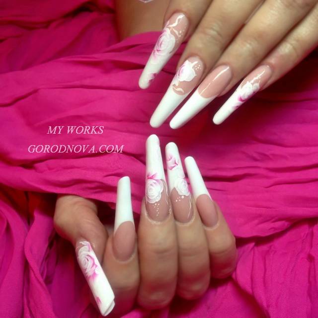 «Балерина» выглядит стильно и экстравагантно сама по себе, поэтому не требует наличия яркого дизайна. Девушки часто выбирают матовое покрытие с минимальным количеством страз. Идеально подобает для обладающих узкими кистями рук и длинными пальцами.