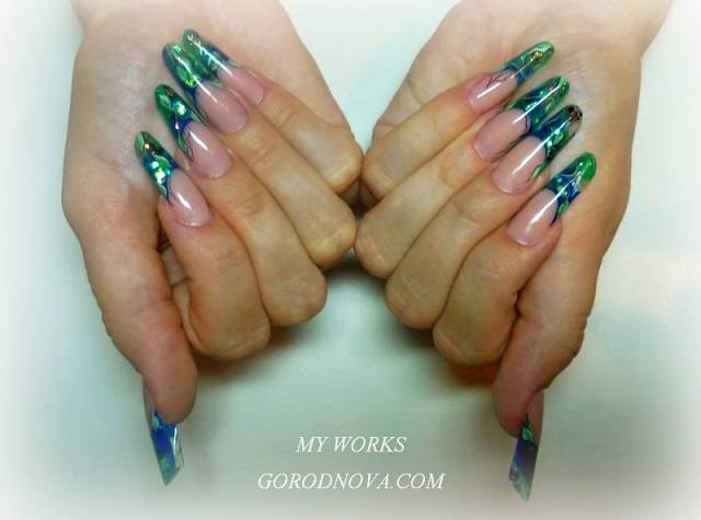 Очень оригинальное наращивание, оно напоминает крыло бабочки: от серединного ребра грани прогибаются в изящную дугу. Сверху вид напоминает перо для письма – это, однозначно, верх оригинальности и фантазии. В сочетании с узорным дизайном пальцы действительно выглядят так, будто на них сели бабочки. Удивительная форма нарощенных ногтей: фото блэйда докажет вам это.