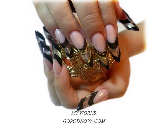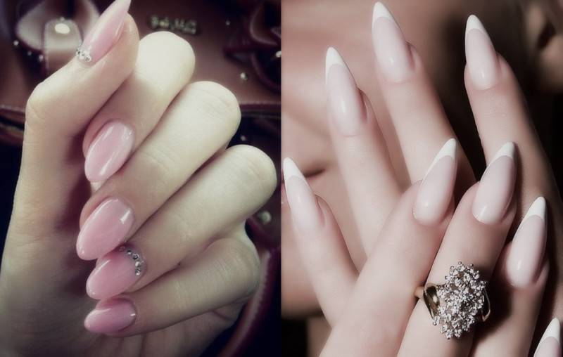 Экстравагантный выбор для смелых женщин. Основа для нее должна быть длинная, роговая пластина сужается и округляется на свободном крае. Такая техника делает пальцы длиннее, что позволяет придать любым ручкам изящества. Миндалевидная форма на средней длине выглядит вполне натурально. Отличается удобством ношения, поэтому «миндаль» выбирают и взрослые работающие женщины.