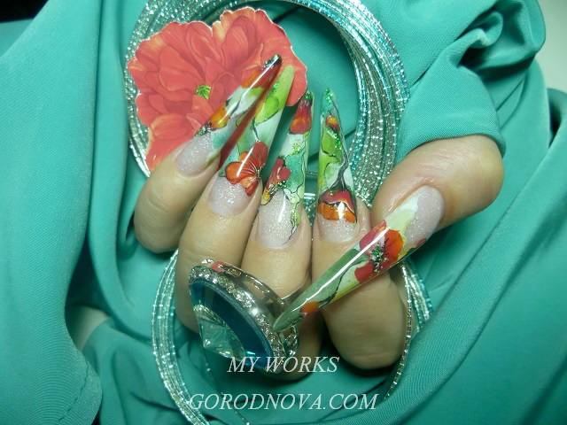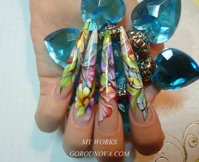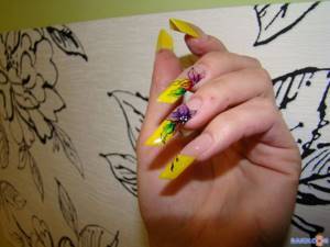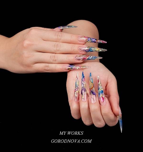 На фото достаточно хорошо видно, что длина у наращенных ногтей весьма немаленькая. Чаще всего такую делают не для повседневной носки, а для выставки или конкурса. Примечательно, что эйдж меньшего размера (всего на 1-3 мм) гораздо легче переносится при ежедневных делах.