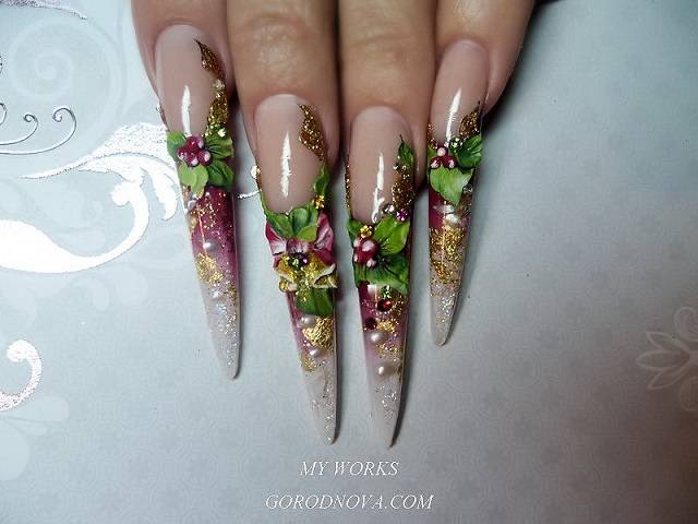 Эту форму нельзя назвать практичной, но она неизменно привлекает к себе внимание. Для такого маникюра используются акрил или гель, разнообразные декоративные элементы