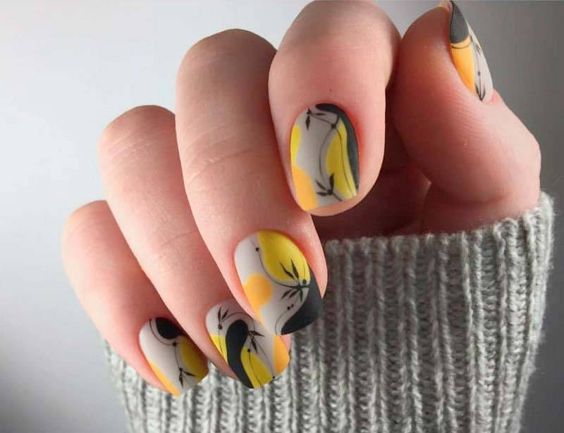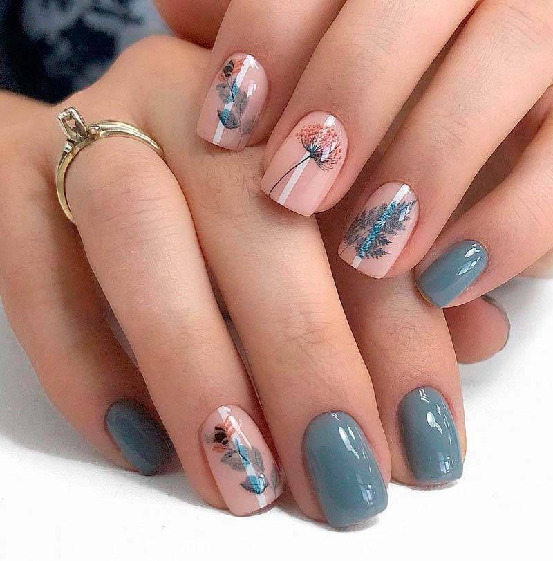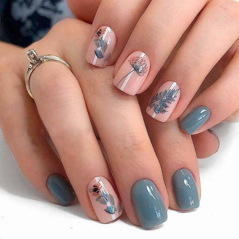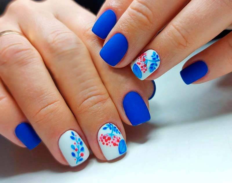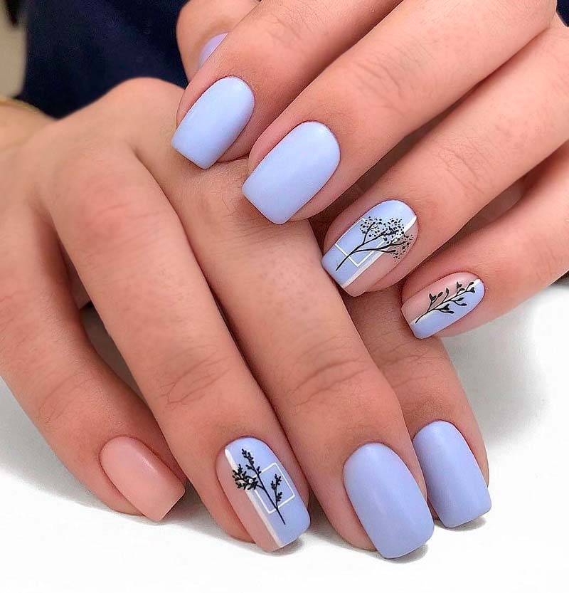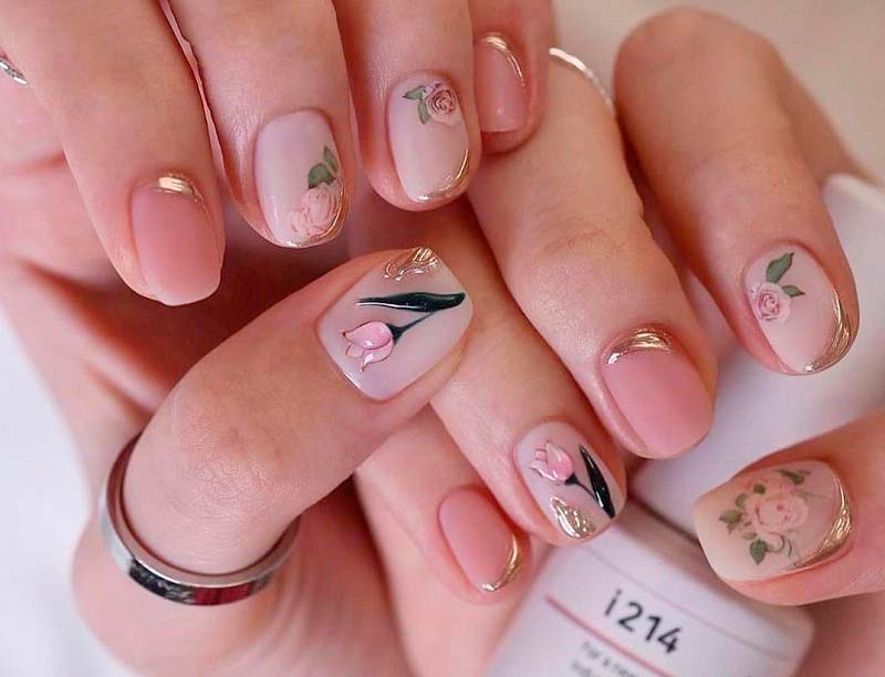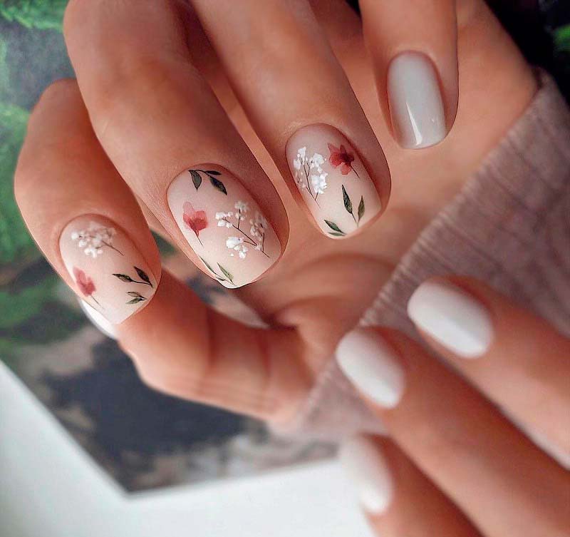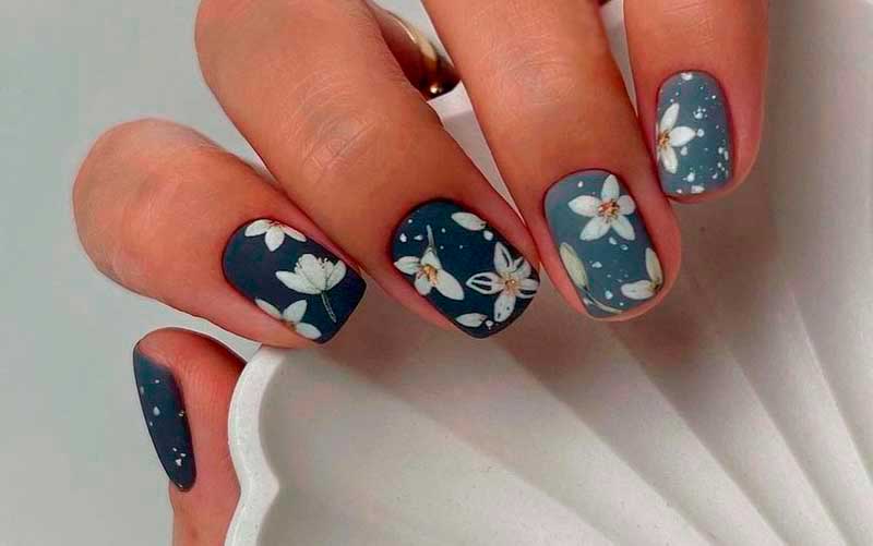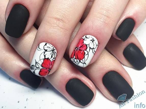 - Цветы. Еще один универсальный маникюр, который уместен в любое время года и на ногтях любой длины. Например сегодня такие узоры наносят под матовое топовое покрытие.