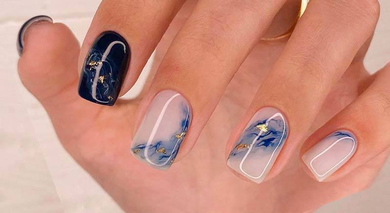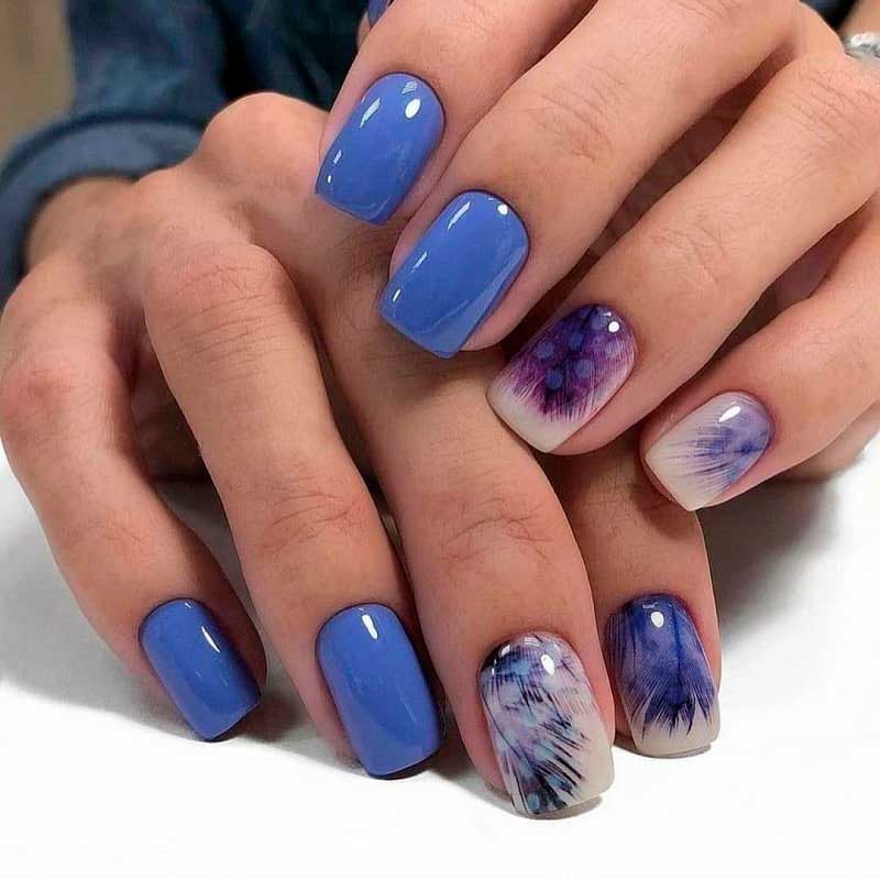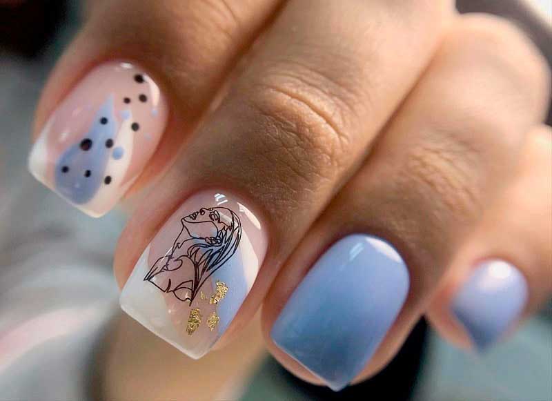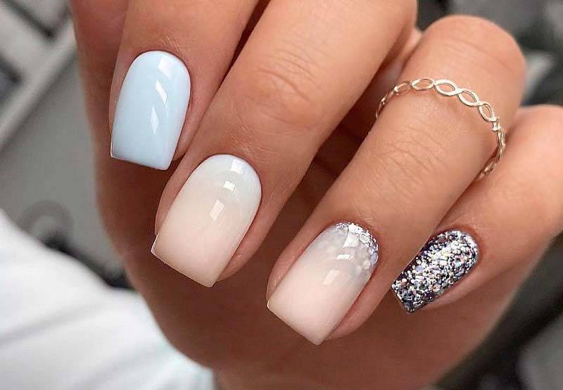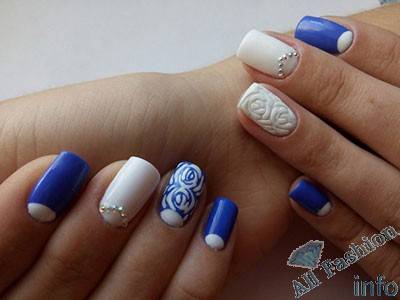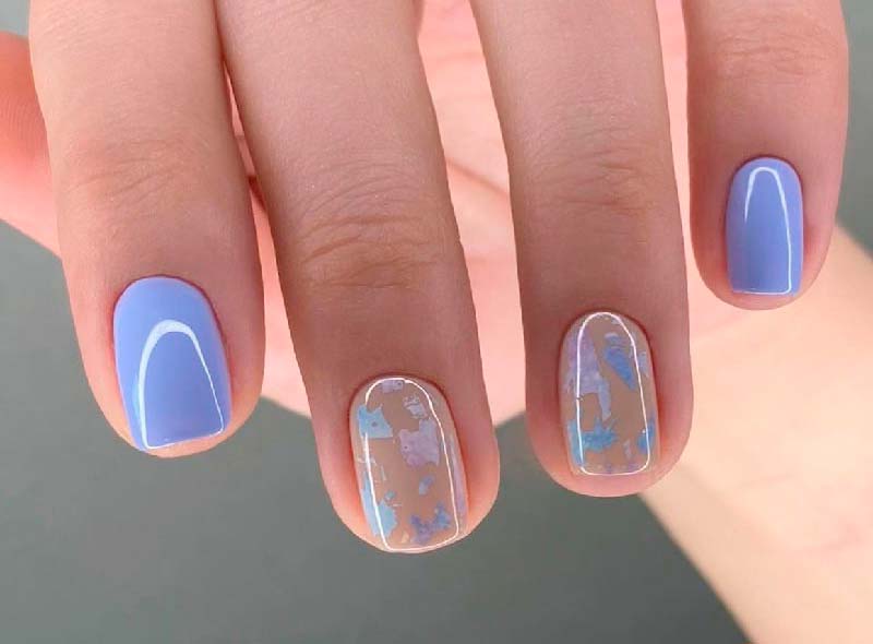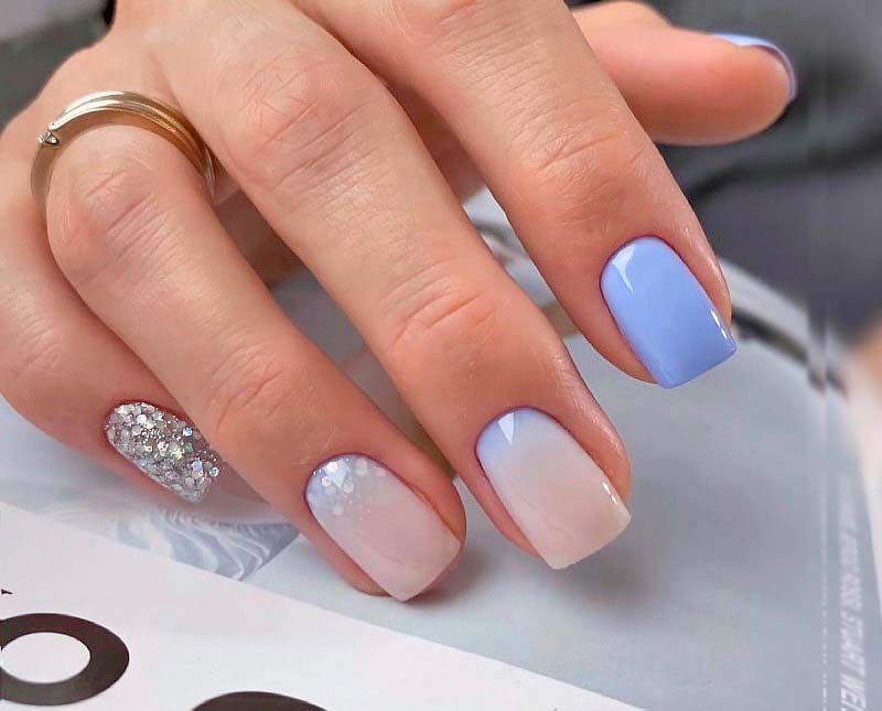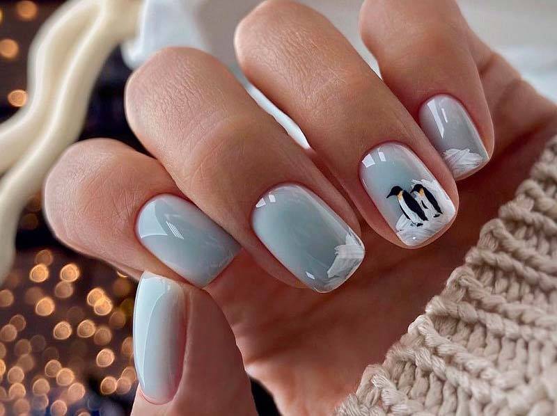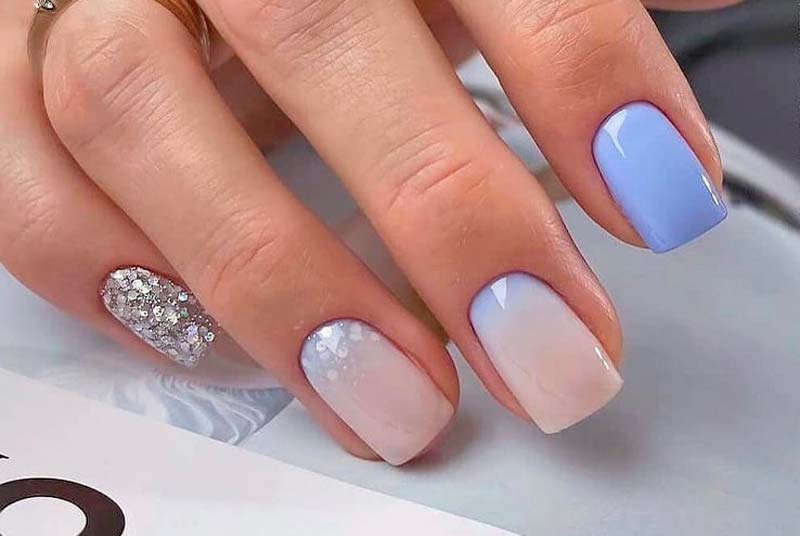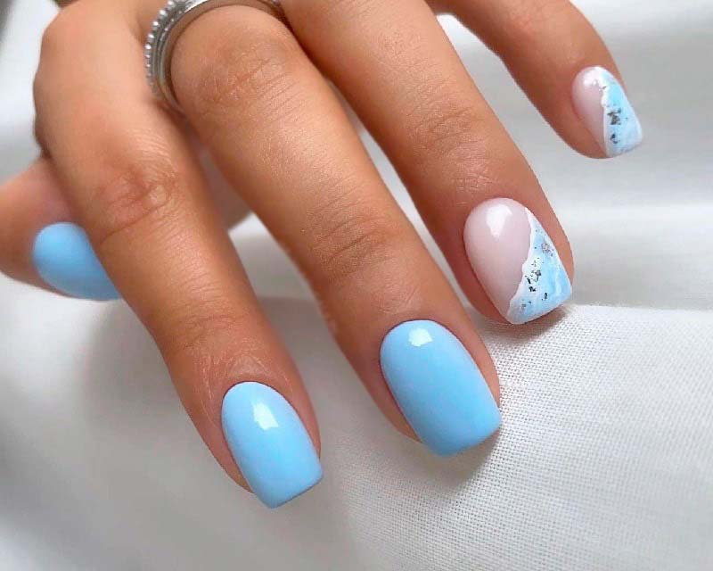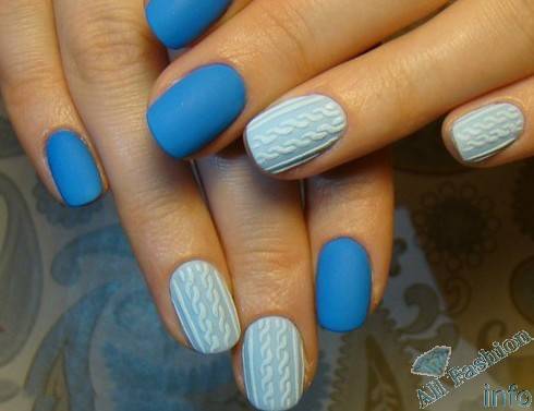 Голубой прекрасно сочетается с белым, нежно-желтым или розовым. Этот цвет часто используют в новогоднем варианте нейл арта.
