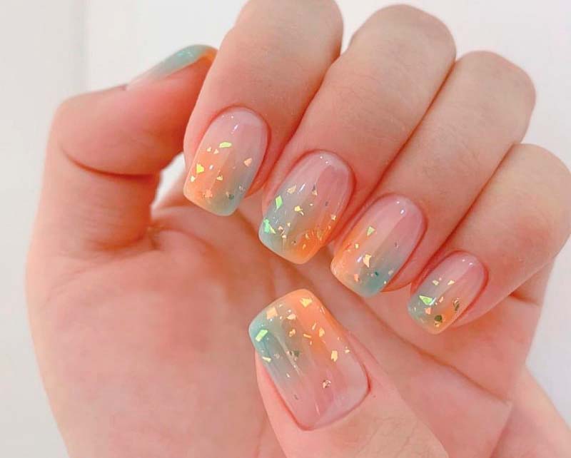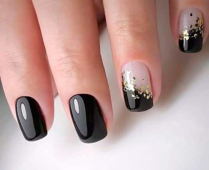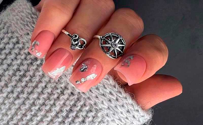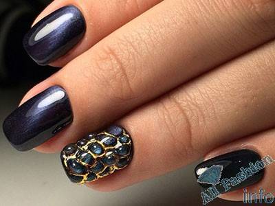 - С фольгой, блёстками, чешуёй. Самый простой и безусловно красивый материал для декора ноготков. Фольга бывает разных оттенков, ее наносят как в качестве акцента на один ноготь или на все ногти.