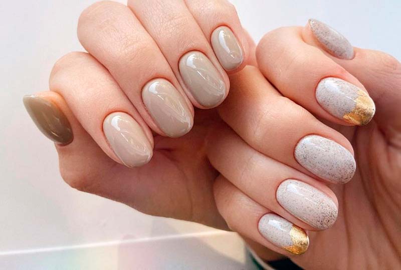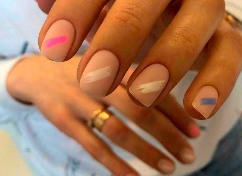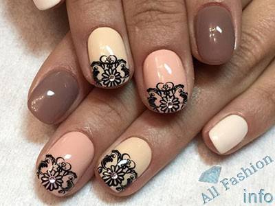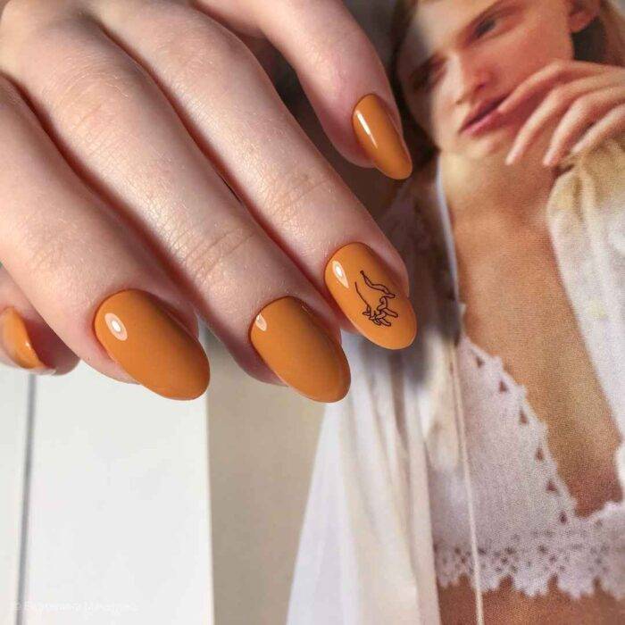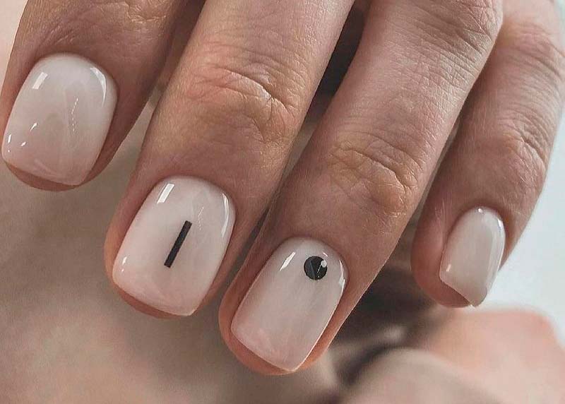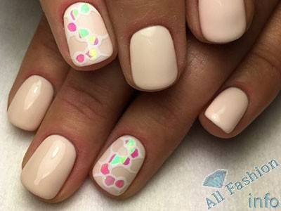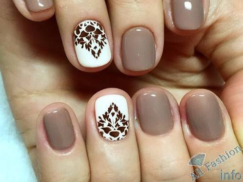 Дизайнеры маникюра советуют все же поддаться модным тенденциям и разбавить монохромность маникюра выделением одного-двух ноготков фактурным лаком или другим оттенком. К примеру, накрасить все ногти глянцевым лаком бежевого цвета, а безымянный выделить фактурным, но на тон светлее. Еще одним интересным вариантом может стать сочетание светло-абрикосового оттенка и цвета какао, которые отлично гармонируют друг с другом по законам колористики.