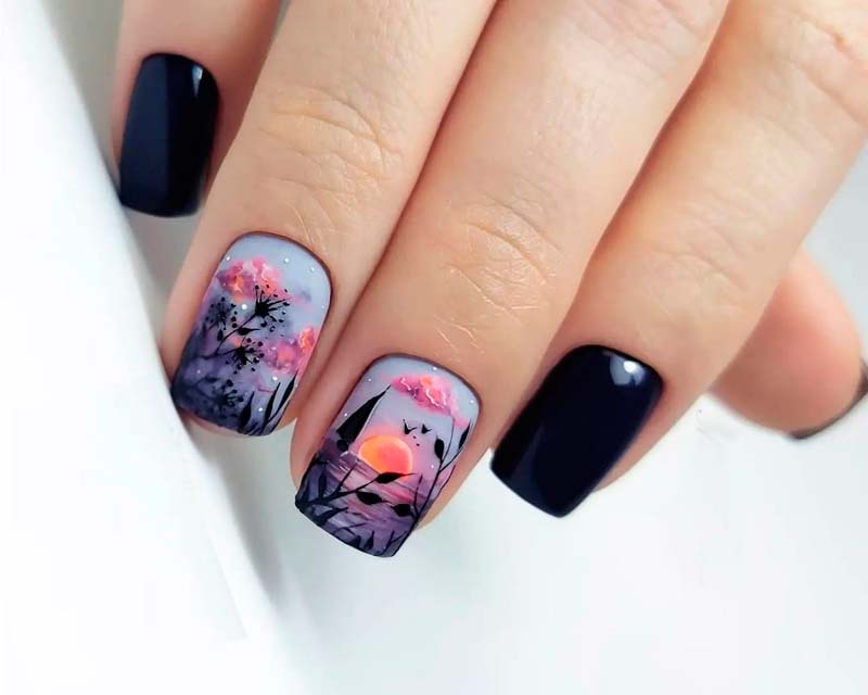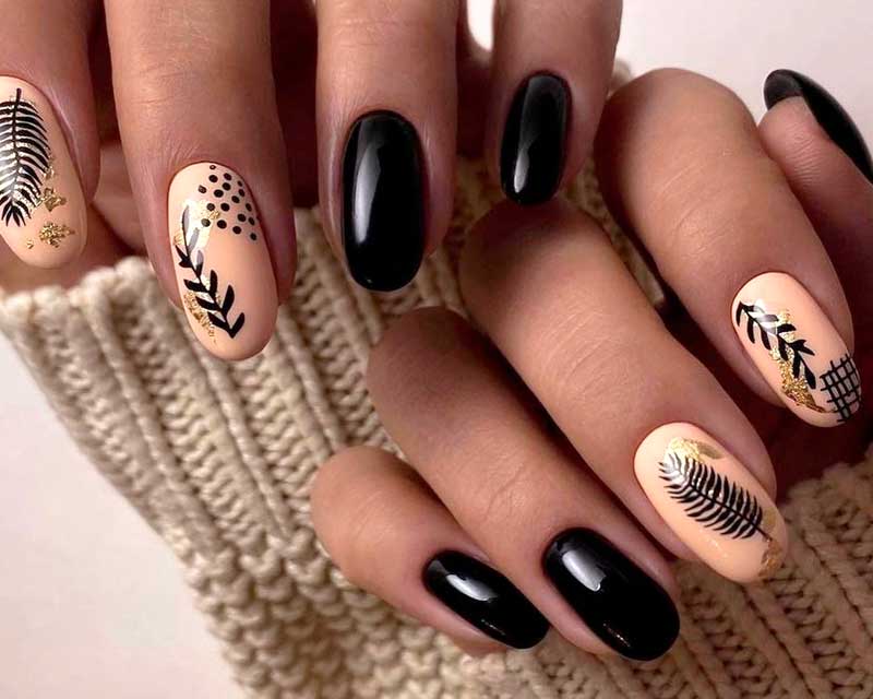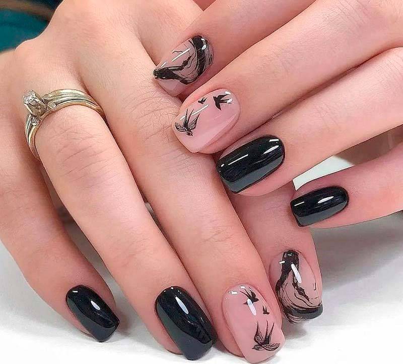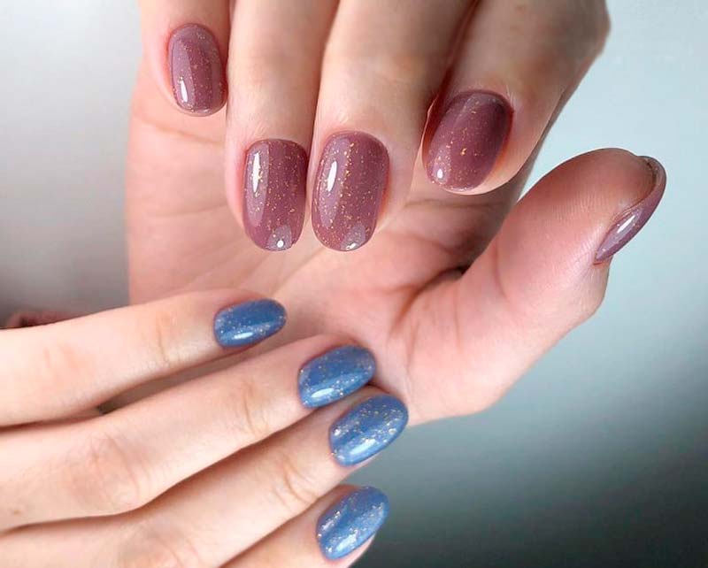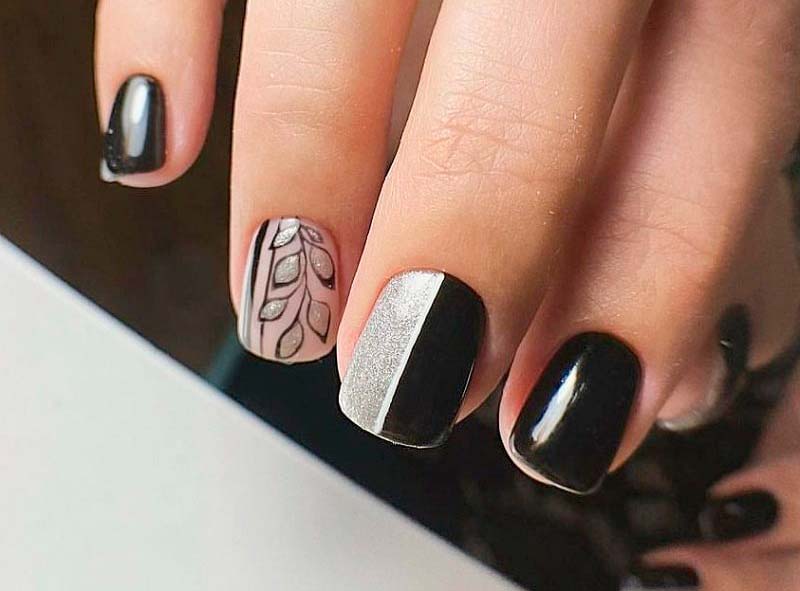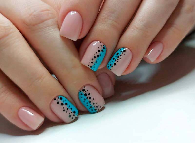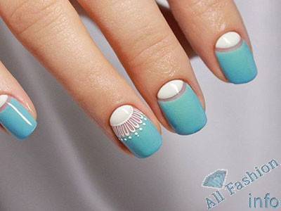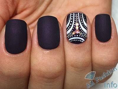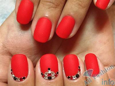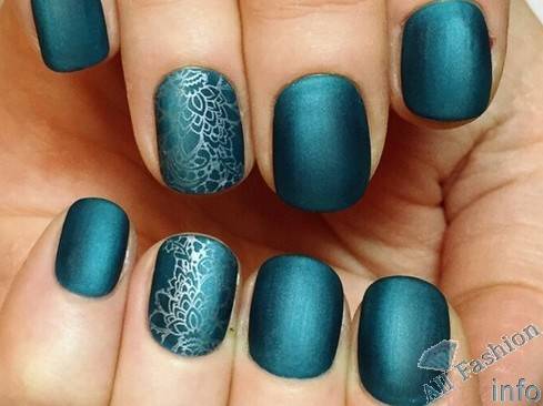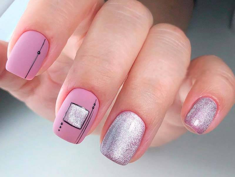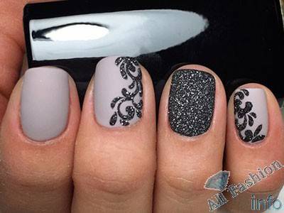 Актуально будет добавить рисунки геометрических фигур, птичек или белый горошек. Невероятно красивый дизайн можно получить, если покрыть все ногти матовым лаком, а на безымянный палец и мизинец нанести блестки. Такое оформление ноготков сегодня можно часто увидеть на фото голливудских звезд.