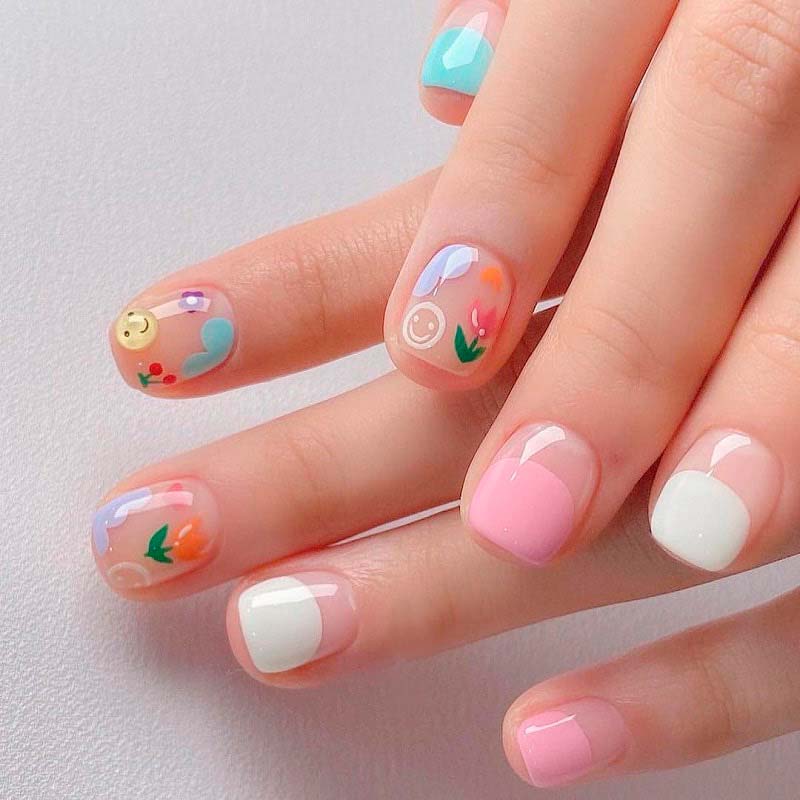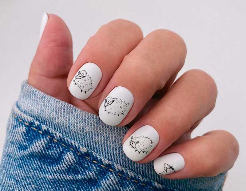 Это наиболее популярный дизайн для коротких ногтей. Чтобы самостоятельно добиться нужного эффекта, приобретите набор для его создания, куда включены наклейки, белый и прозрачный лаки.