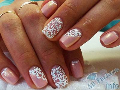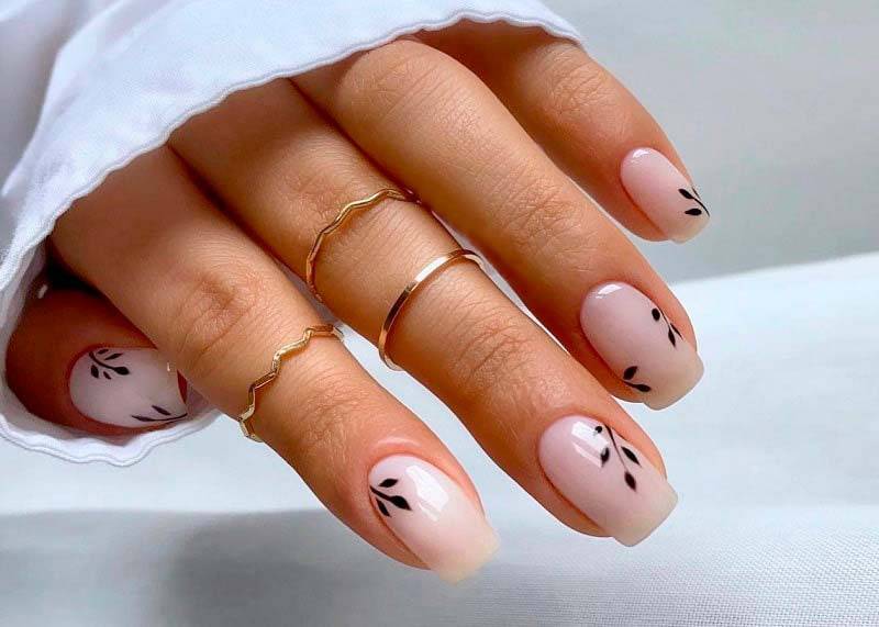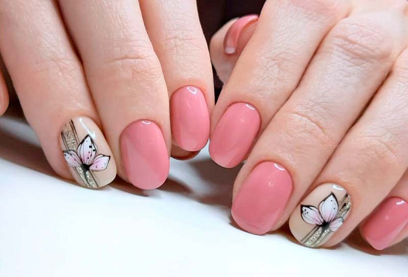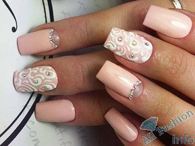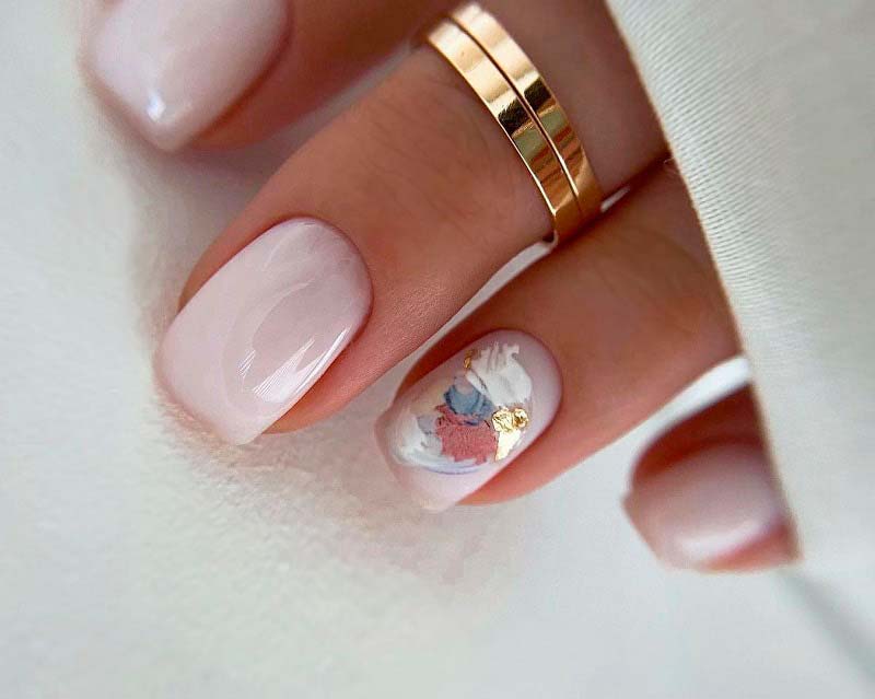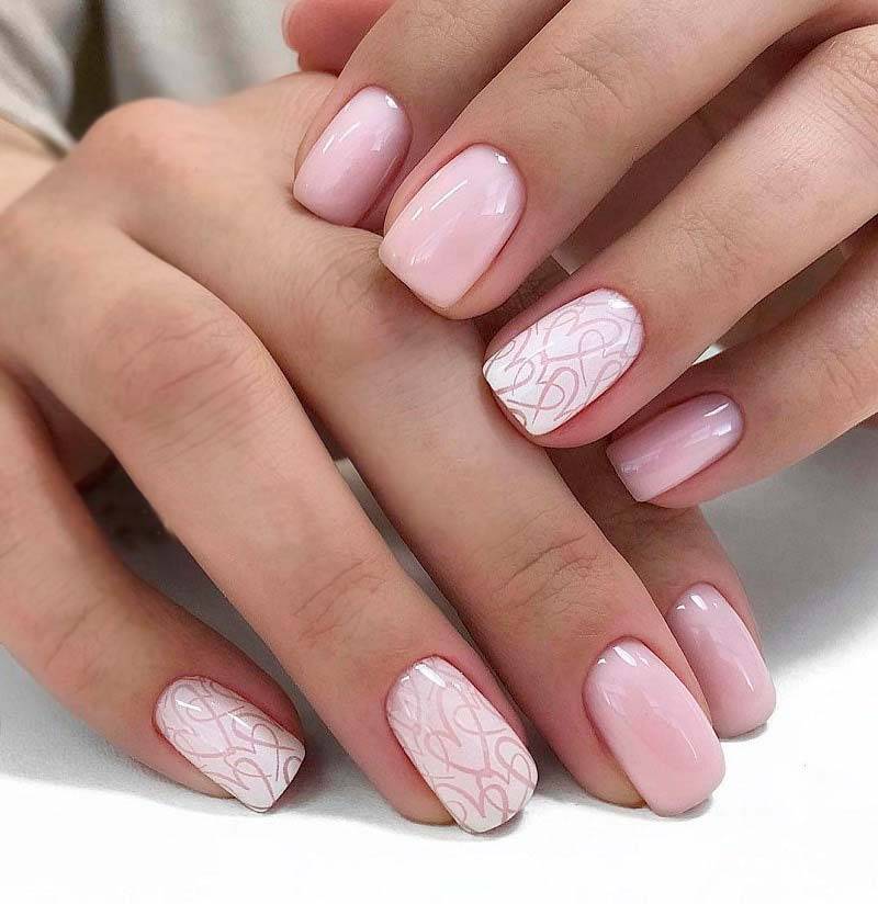Не стоит забывать и о росписи на ноготках с естественным оттенком, которая станет «изюминкой» маникюра. Изображение мелких роз в бледных оттенках на двух ноготках в окружении светло-розового цвета будет смотреться очень женственно и изящно. Также можно использовать два лака одного тона, один из которых будет фактурный — для изображения узоров, второй глянцевый — для основы. Немного удлинить ногти поможет техника омбре с переходом одного естественного цвета к другому.