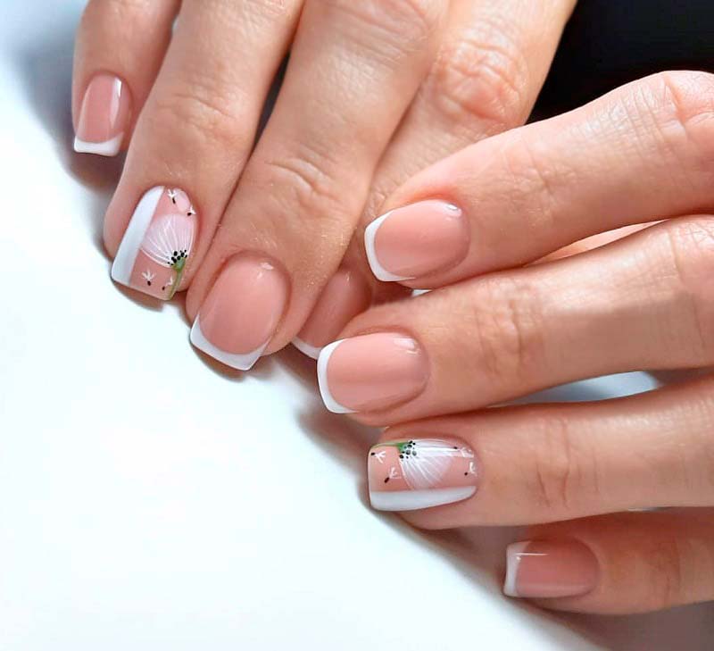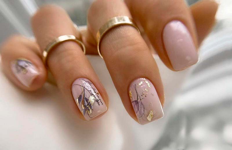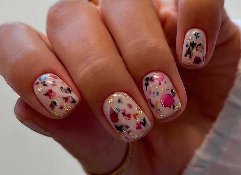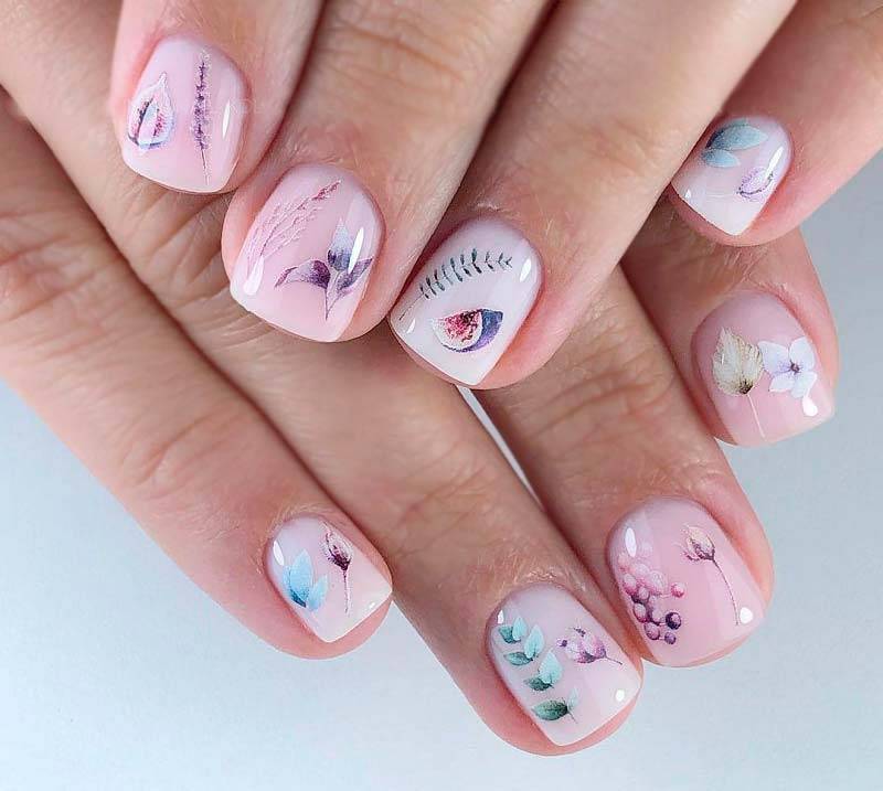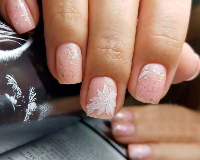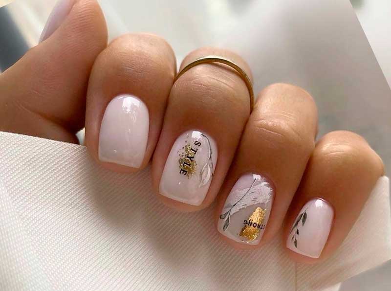 Нежный маникюр на коротких ногтях в нюдовых оттенках с сухоцветами.