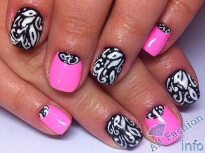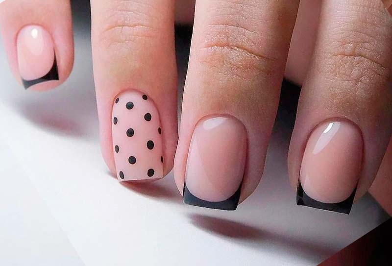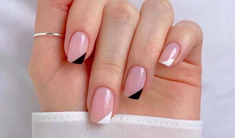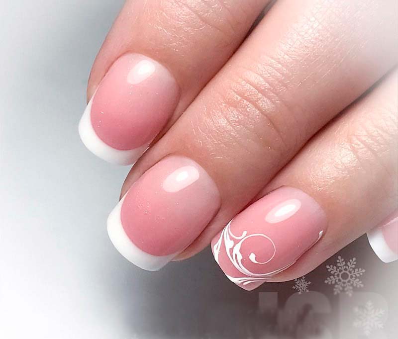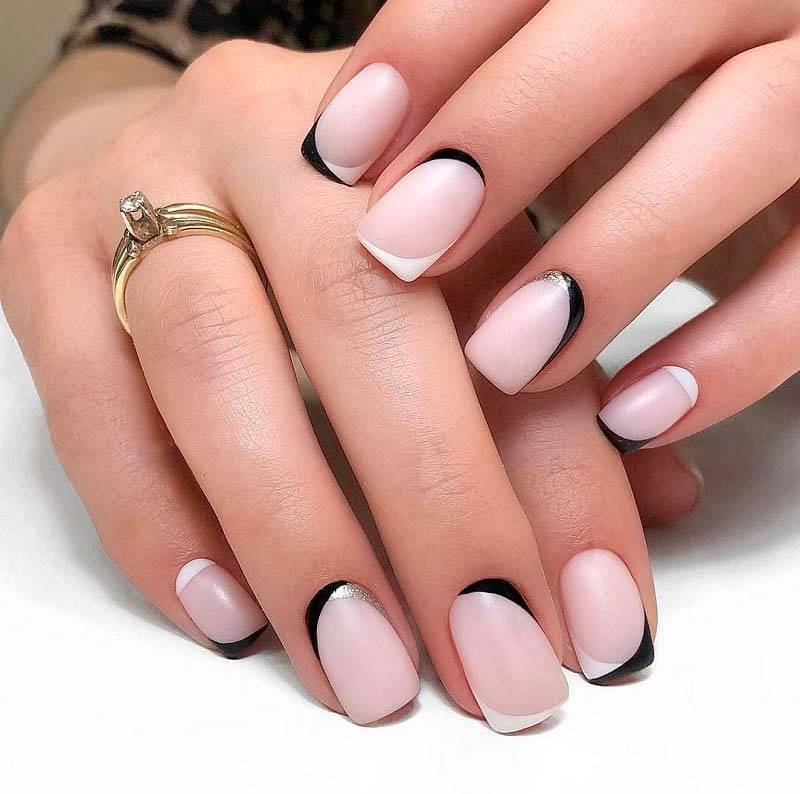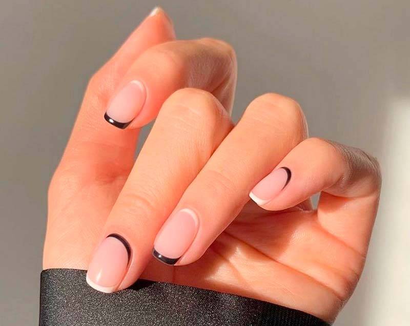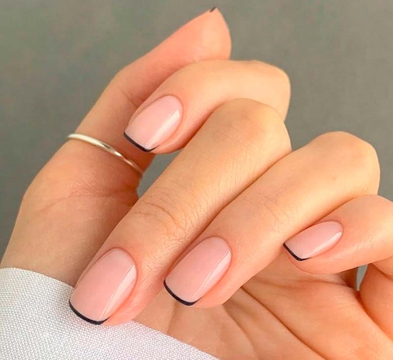 Френч (французский маникюр) давно и прочно вошел в один из самых популярных запросов наших женщин. Он представляет собой ногти, покрытые лаком нюдовых оттенков (светло-бежевого или нежно-розового). Необычно красиво и ярко он на коротких ногтях. Особенно, где линия улыбки и область лунки закрашены черным