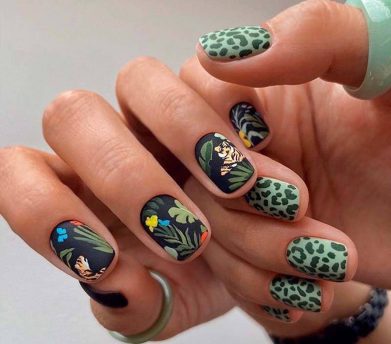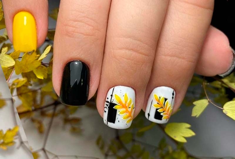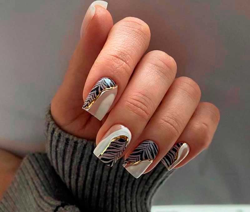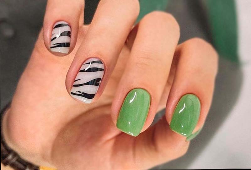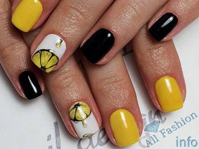 Этот цвет очень стильно смотрится в сочетании с желтым гель-лаком. Маникюр становится солнечным и точно сможет поднять настроение своей обладательнице. Необычный дизайн можно создать при помощи животного принта. В моде рисунки, имитирующие кожу зебры и коровы, можно добавить иллюстрации в виде змей и драконов — будет выглядеть новомодно и свежо.