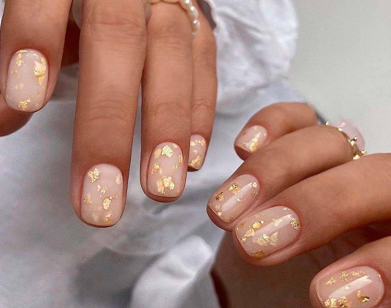 Золотистый оттенок на коротких ногтях смотрится просто превосходно. Обилие блесток в этом случае не подойдет. Маникюр должен быть в строгом исполнении, так как сам оттенок уже добавит праздничного настроения.