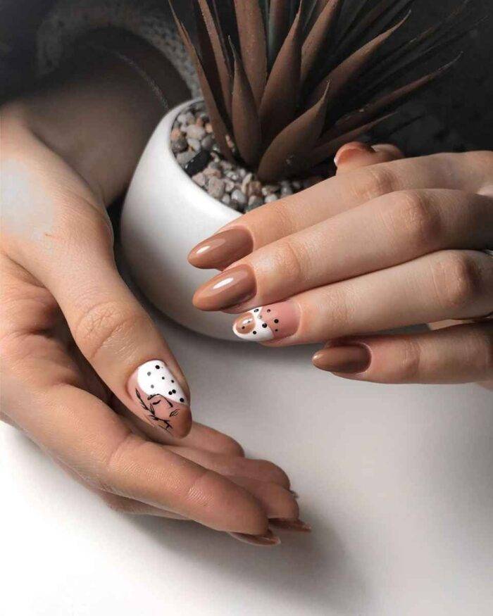 Использовать кофейные оттенки можно как в однотонном маникюре, так и комбинировать в разных вариациях модного нейл-дизайна. Создать утонченный и интересный вариант нейл-арта поможет цветовые акценты на ногтях. Например, можно использовать фоном нежно-пудровый оттенок, а дополнить дизайн дополнительно проработав ногти стилем «лунный маникюр» различными цветами.