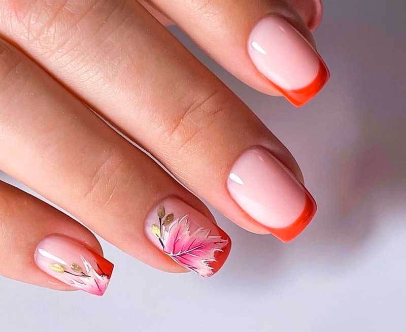 Часто встречается, красиво выполненный, френч на контрасте. Например, где улыбка выделена черным или красным. Однако, многие женщины предпочитают традиционный классический френч, но одну или несколько ногтевых пластин отводят под оформление, где создаются необычные надписи или рисунки.