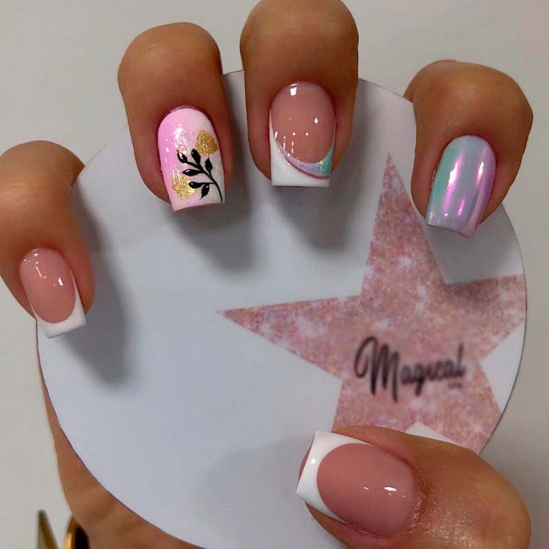 Благодаря умению мастеров нейл-арта теперь френч нельзя назвать скучным. Если раньше это был простой и незамысловатый дизайн, то сейчас они умело сочетают цвета и разные техники. В этом случае цвет линии улыбки может быть любым (в отличие от классического).