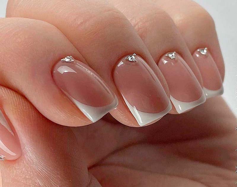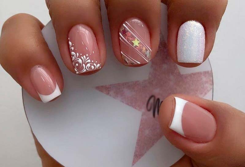Скучные нюдовые тона френча умело разбавляются не только добавлением контрастных цветов, но и добавлением блестков серебра или золота. Небольшие детали дизайна, как рисунки и стразы привносят нежные нотки в такой, казалось бы строгий маникюр как френч. Главное — соблюсти меру.